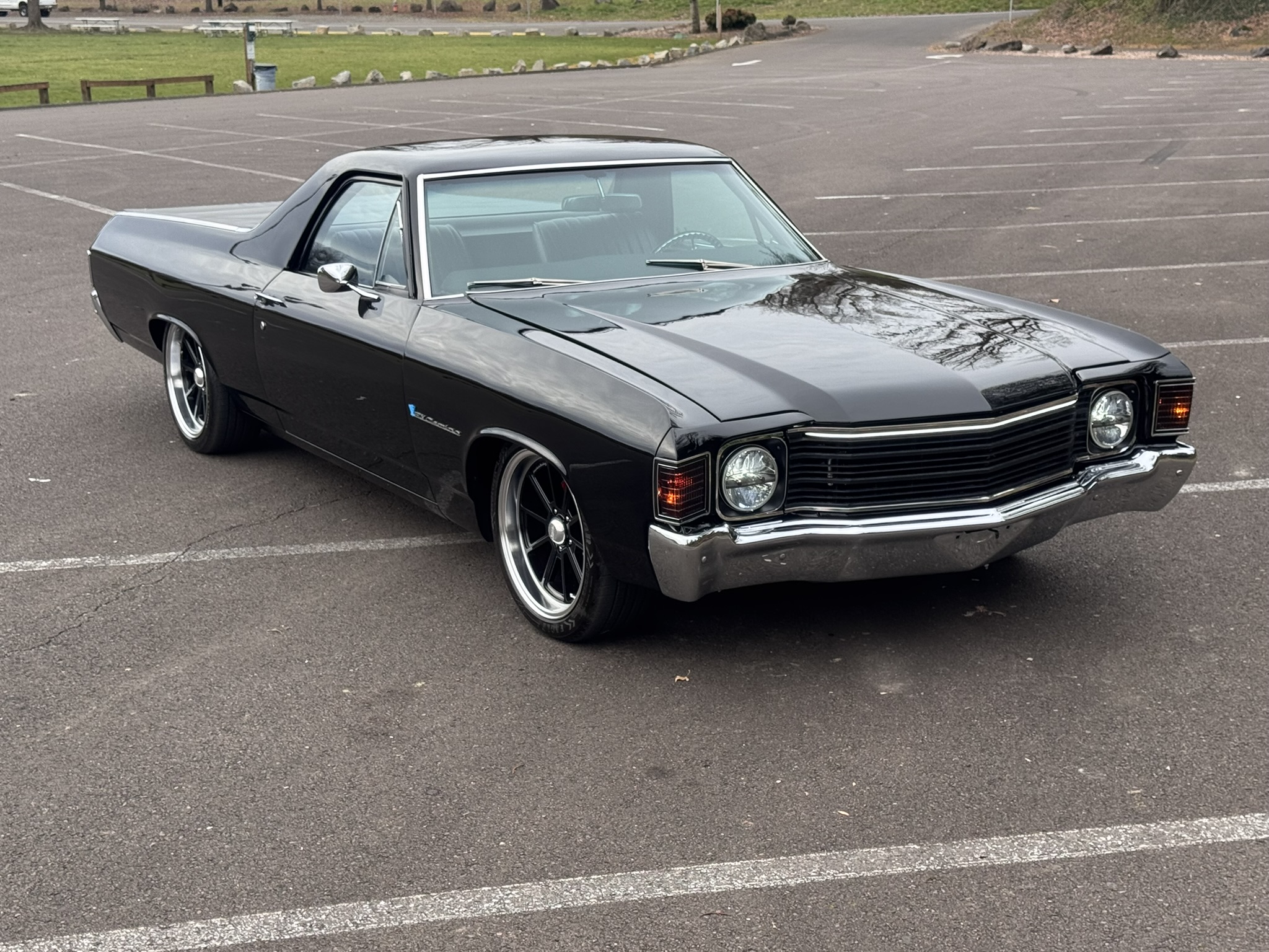 This "EV Camino" showcases a custom electric powertrain conversion with dual NetGain Hyper 9 motors. The sleek, smooth black body and modern interior nod at its extensive modifications, including Mustang II suspension, Wilwood brakes, and retro-styled Dakota Digital gauges.