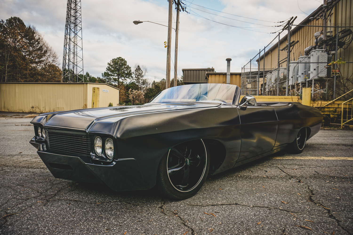 This 1970 Chevrolet Impala has been transformed into a striking 2-door roadster, featuring a matte black finish, custom bumpers, and 20" Foose wheels. Its aggressive stance is highlighted by an adjustable airbag suspension, while the interior sports Corbeau bucket seats and a custom dash.