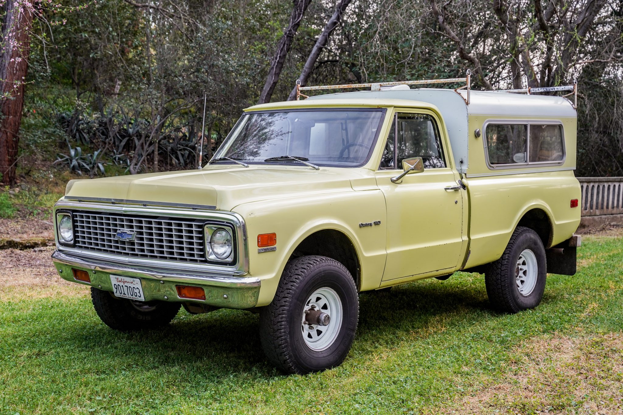 This 1972 Chevrolet Custom K10 pickup exudes classic utilitarian charm with its Light Yellow finish, paired with a distinctive yellow and white camper top. Previously serving the Nevada State Troopers, it offers vintage appeal along with modern functionality, epitomized by its 350ci V8 engine, four-speed manual transmission, and dual-range transfer case.