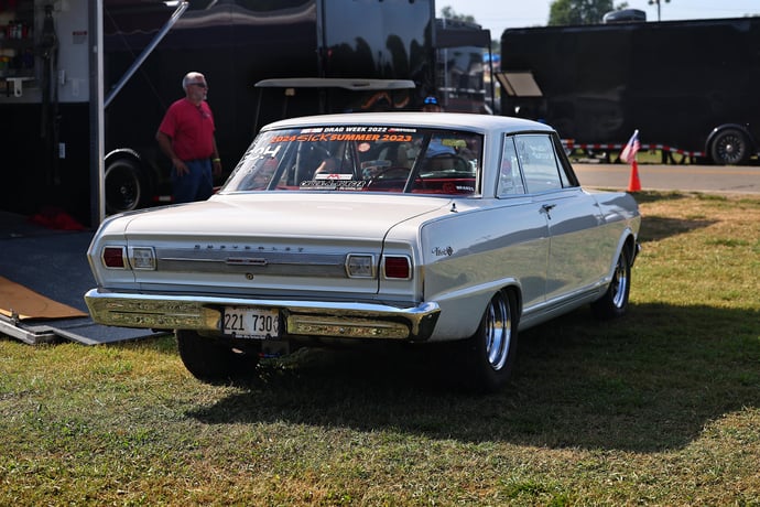 Dean Tepen's 1965 Nova SS, showcased at LS Fest East, features a powerful 427ci LS engine with a Hilborn stack fuel injection. The engine is enhanced with Frankenstein M311 cylinder heads and a Cam Motion camshaft, all managed by a Holley Terminator X EFI system. The car retains its original white color with Weld Wheels and Mickey Thompson drag radials, complemented by a Church Brothers front suspension and Calvert Racing components in the rear. Inside, the Nova maintains a classic appearance with red factory bucket seats, a 6-point roll bar, and a mix of modern and stock instrumentation.