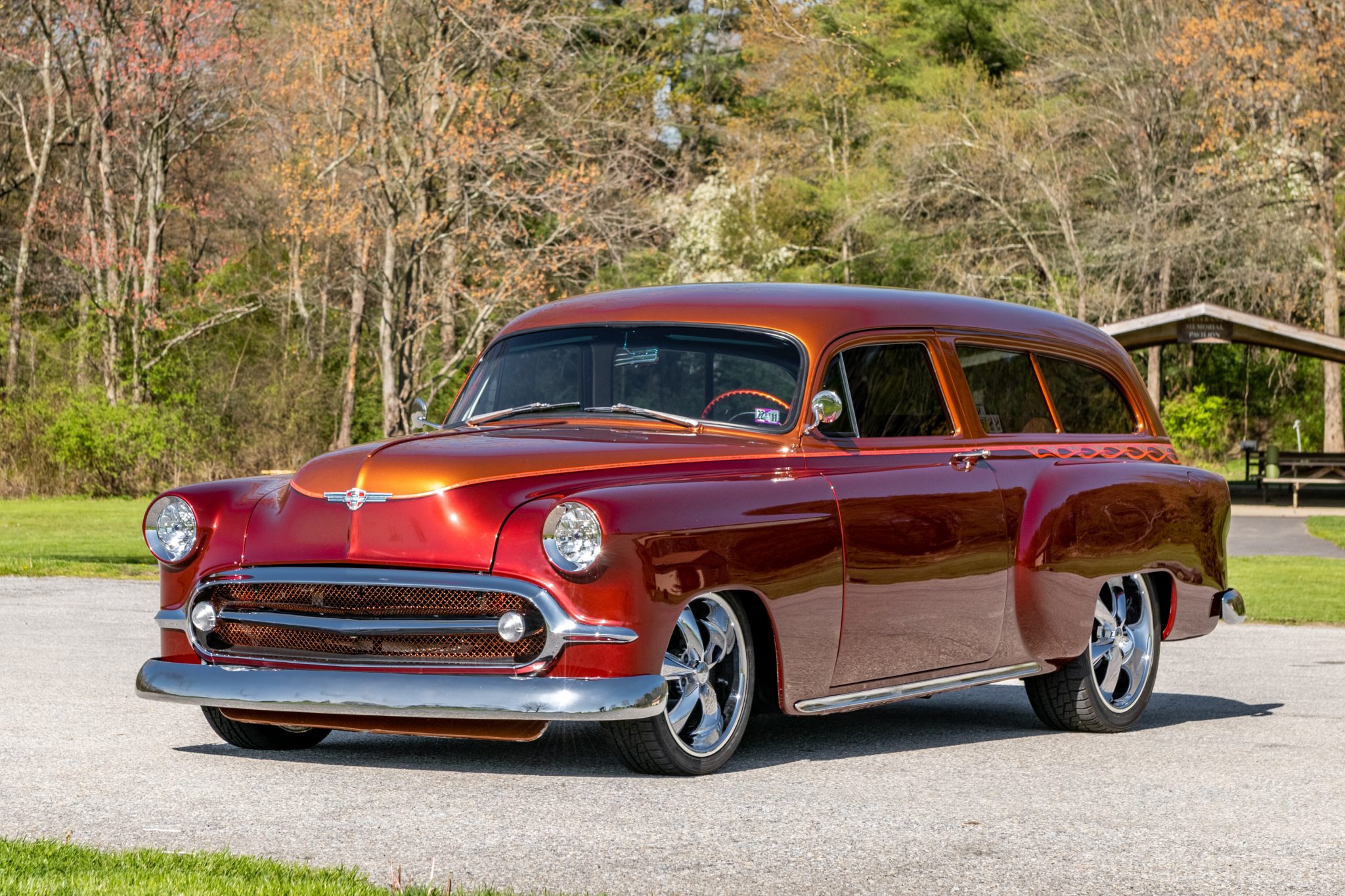 This 1953 Chevrolet wagon is a unique custom build, combining two Handyman wagons and a sedan. It features a metallic red finish with a copper roof, a chopped and smoothed body, and bold pinstripes. Under the hood, a 327ci V8 pairs with a striking interior, featuring brown leather and bespoke details, embodying a classic hot rod spirit.