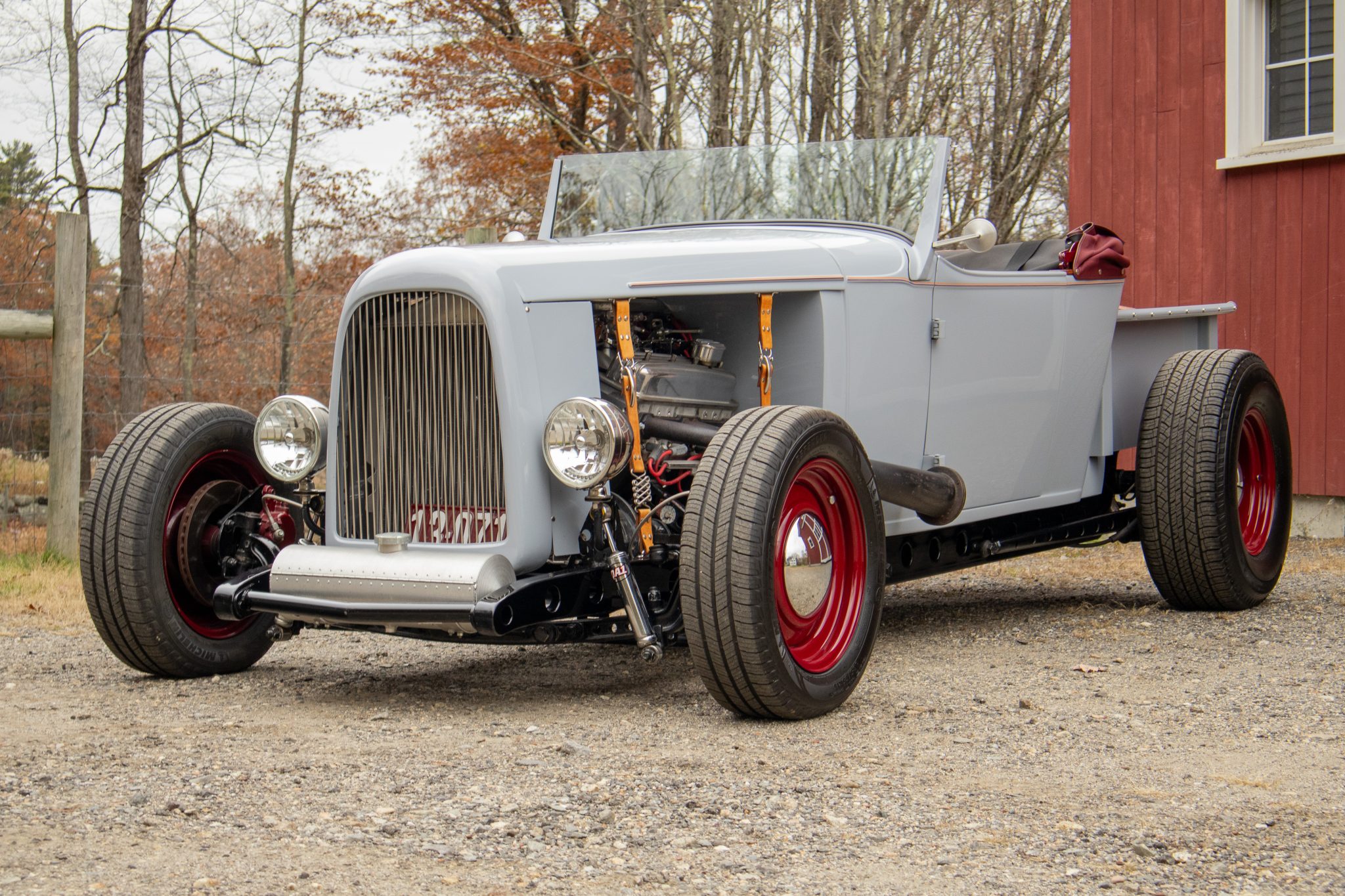Built with a 350ci ZZ4 V8, this custom 1931 Chevrolet hot rod features a fabricated frame, red-steel wheels, and a maroon soft top paired with distinctive gray paint and multicolor pinstriping. Its retro feel is accentuated by lake-style headers and a wood-lined cargo bed.