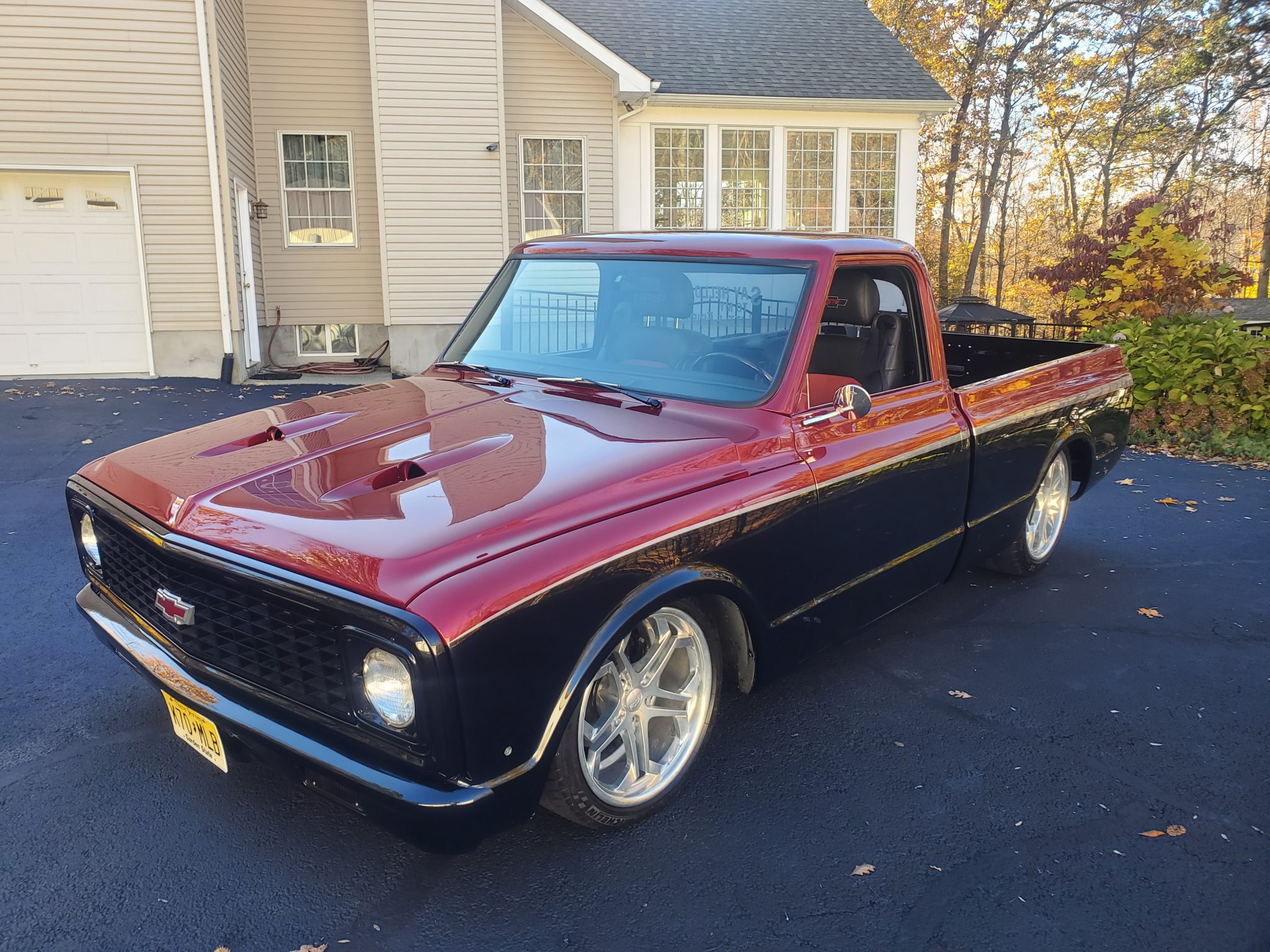 This custom 1971 Chevrolet C10 blends a striking red and black paint scheme with silver accents and extensive modifications, including a 572ci V8 engine, modern suspension setup, and luxurious interior elements. The truck features a customized body with shaved trim, molded air intakes, and a wood-plank bed floor, creating a unique blend of classic style and modern upgrades.