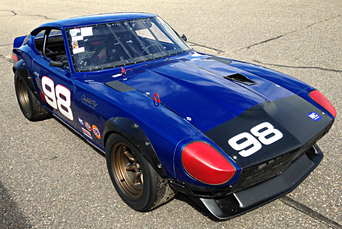 This 1973 Datsun 240Z race car, built for vintage racing, features a competitive L28 engine with a Schneider cam, Holley carburetor, and an S13 5-speed transmission. It showcases bold styling with a fiberglass hood, bolt-on fender flares, and a striking blue paint finish.
