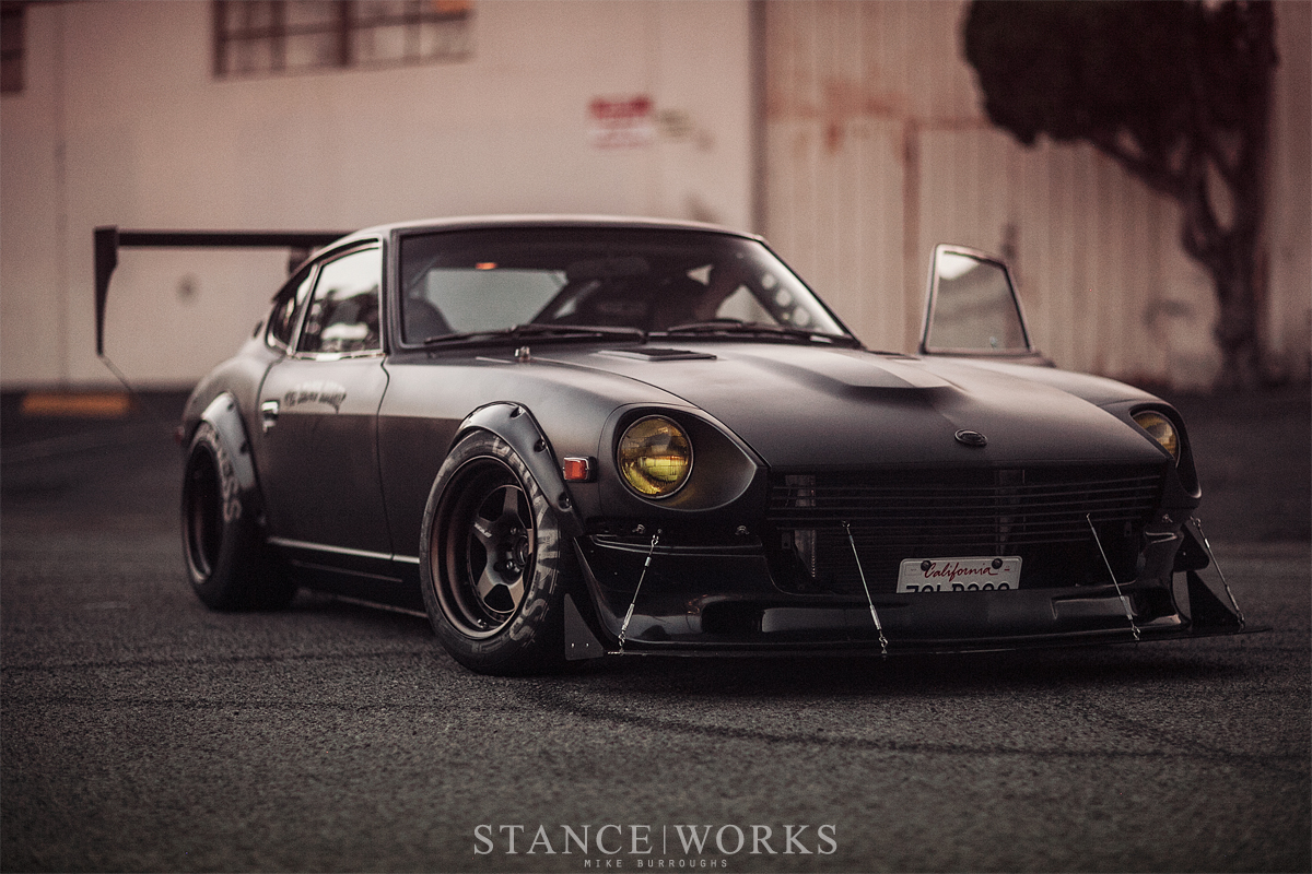 Riley Stair's 1974 Datsun 260Z roars with a Corvette LS6 engine tucked under a sleek flat black exterior. The build is tailored for performance with prominent aero pieces and a refined, menacing style. With bronze-lipped Work Meister CR01 wheels, it's designed purely for the joy of burnouts, showcasing unique craftsmanship and flair.