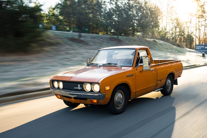 Blake Tomlinson's 1974 Datsun 620 underwent transformations to enhance reliability while maintaining its classic charm. Originally found in Oregon, the truck was in rough shape with a heavy wooden camper. Under the hood is a swapped 2.0-liter L20B inline-four engine paired with a five-speed manual from a Nissan 280Z. Enhancements include a Sniper EFI system and a custom stainless steel exhaust. The front suspension utilizes torsion bars for lowering, complemented by three-inch blocks in the rear. Holley RetroBright LED headlights improve visibility. The interior is set for a stock-style revamp after addressing engine issues.
