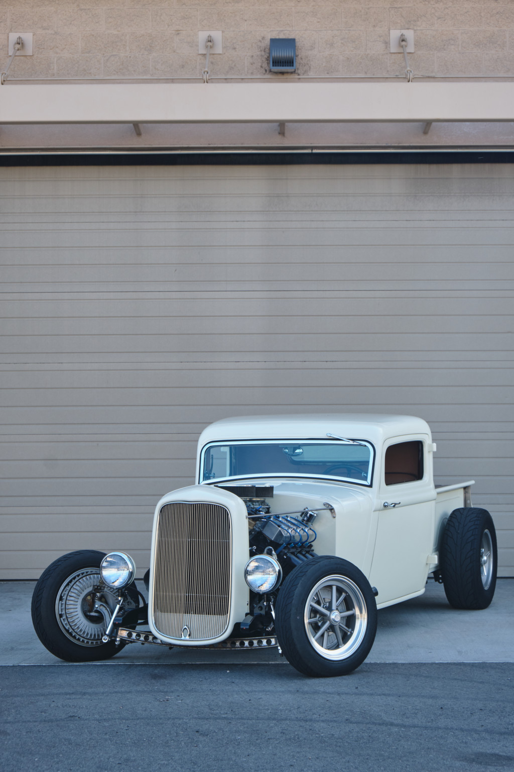 This custom 1934 Dodge Pickup features a massive 500ci Cadillac V8 engine, delivering over 600 horsepower. Gleaming in Creme Brulee finish, it boasts a chopped factory cab with distinctive suicide doors. Highlighted by its hot rod stance, the truck sits on Team III E-T wheels and includes custom-fabricated trim and a 1932 Ford-style grille.