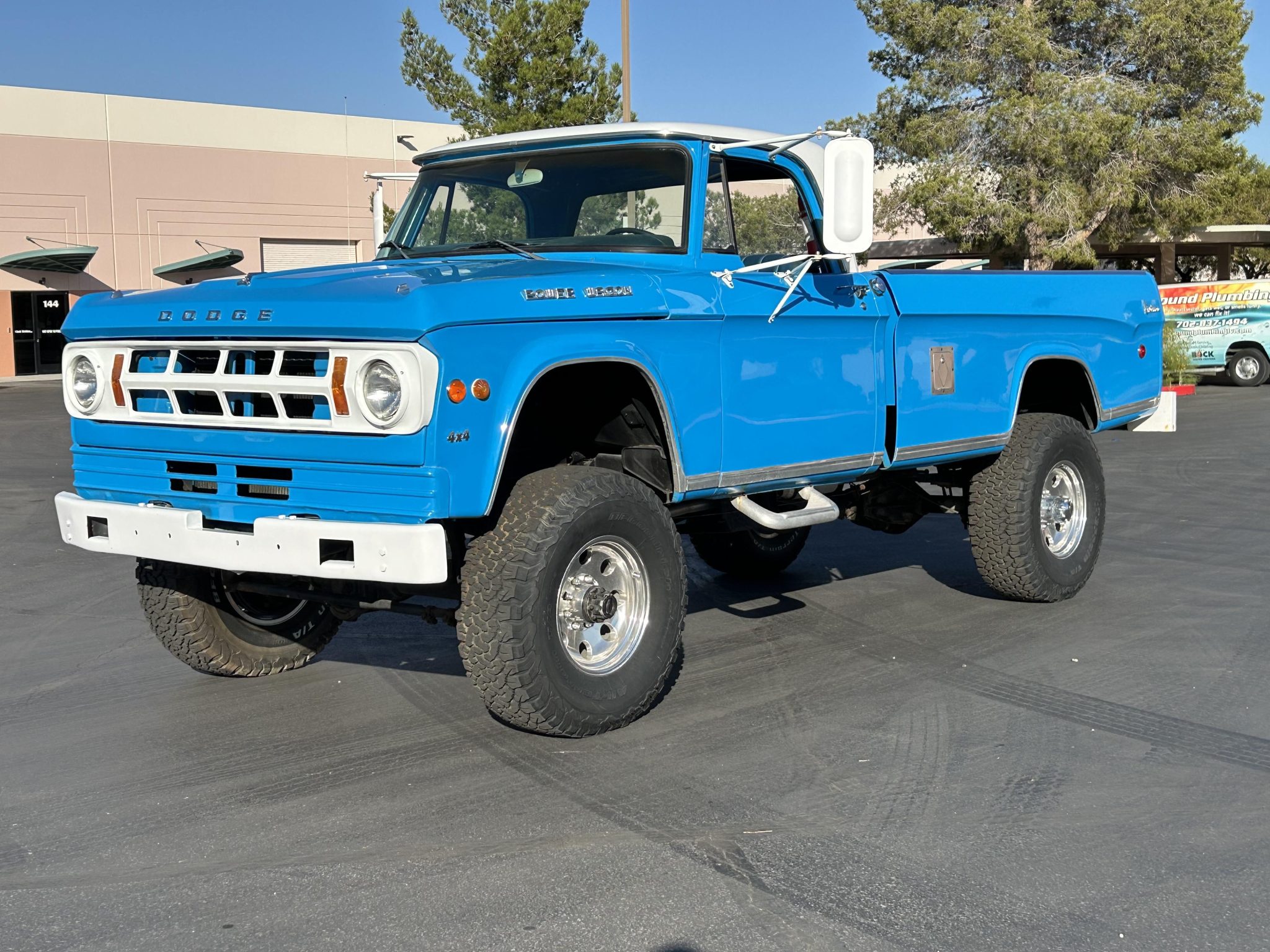 Custom 1969 Dodge Sweptline Pickup with a muscular 4×4 stance, finished in vibrant blue with a white grille and roof. Built on a robust W300 chassis, this truck features a 318ci V8 paired with a four-speed manual transmission, blending vintage style with rugged capability.