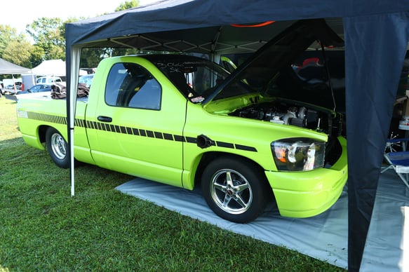 This 2003 Dodge Ram, owned by Dan Mason, stands out at LS Fest East with its twin-turbo LS swap. The truck features an LSA block with LS3 heads, producing 1,100 horsepower thanks to 80mm twin turbos. Built for performance, it includes a Coan Turbo 400 transmission, Ford 9-inch rear end, and Wilwood brakes. The suspension is homebuilt, featuring a four-link and Mustang II-style front end. Running on Mickey Thompson Pro Drag radials, this Ram weighs in at 3,500 lbs. Notably, Mason built the truck himself, and it has clocked a best time of 9.02 at 151 mph.