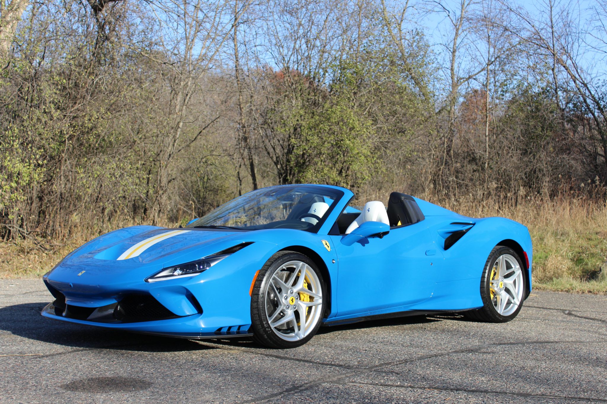 Stunning 2022 Ferrari F8 Spider in Azzurro Dino with distinctive Bianco Avus and Giallo Modena livery, featuring extensive carbon-fiber trim and a retractable hardtop. This convertible boasts a twin-turbocharged 3.9-liter V8, delivering a thrilling 710 horsepower through a seven-speed dual-clutch transaxle. Equipped with SCM-E magnetorheological suspension and a suite of modern amenities, it's a perfect blend of performance and luxury.