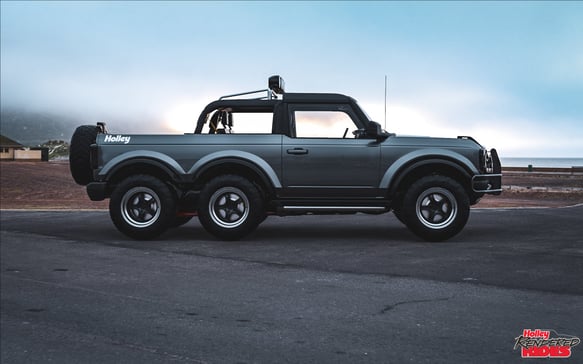 This imaginative render of a 2022 Ford Bronco takes inspiration from vehicles like the Mercedes-Benz G63 AMG 6x6, converting the Bronco into a 6x6 utility pickup. The build includes a tandem axle setup, enhancing its off-road capabilities and towing capacity. It features a removable rack of spotlights and a winch-equipped brush bar, with potential for ambitious engine swaps such as a Raptor EcoBoost V6 or Coyote V8. This 6x6 Bronco is designed for visual impact, resembling military or radical aesthetic vehicles.
