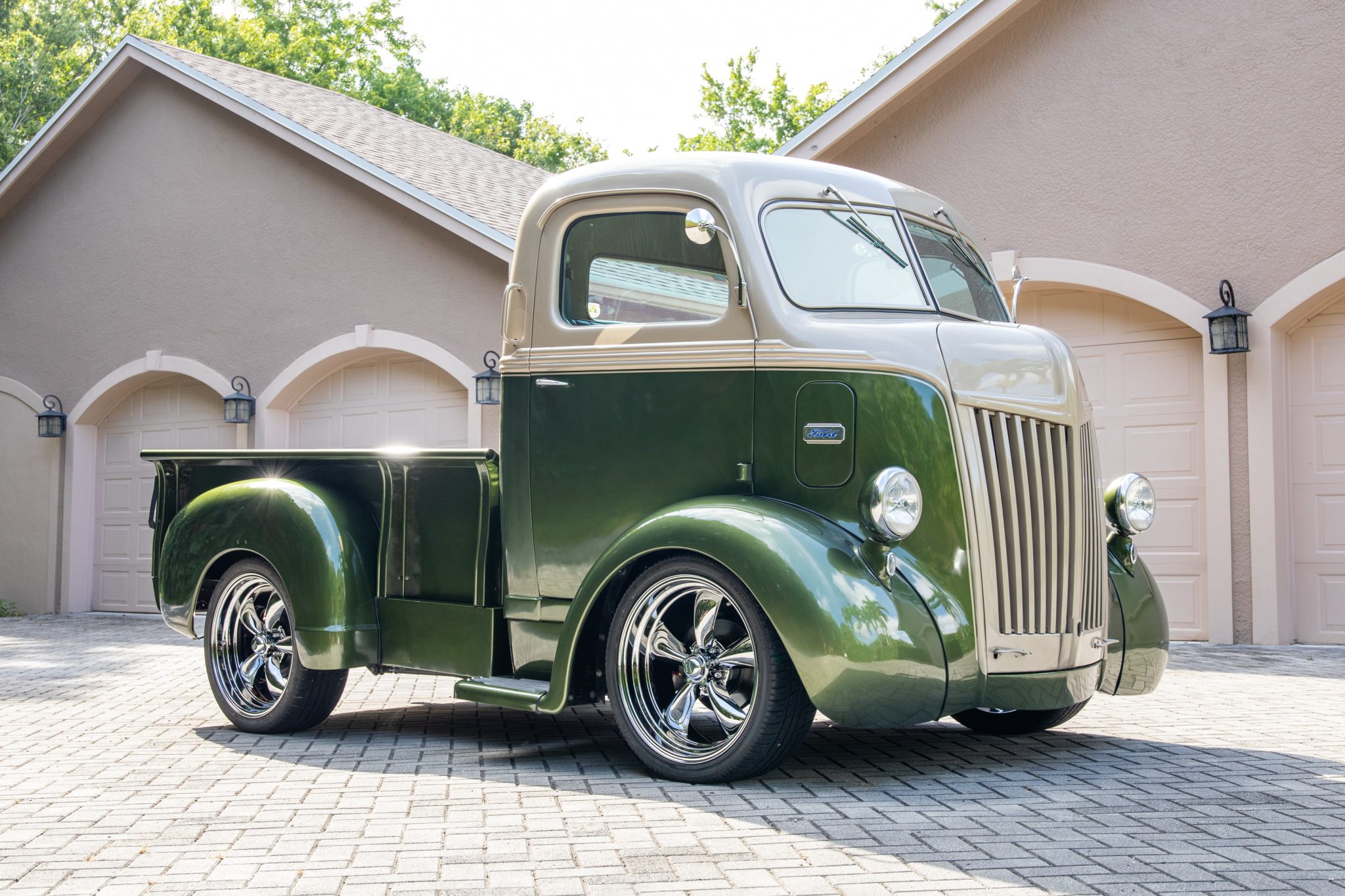 This custom 1942 Ford COE Pickup features a striking two-tone green and beige paint job and rides on American Racing 20” wheels. Built on a modified frame using GM components, it’s powered by a 350ci Chevrolet V8 engine paired with a TH350 transmission. The truck showcases features like a custom rear roll pan, wood bed slats, and a comfortable interior with brown vinyl upholstery and Vintage Air climate control.
