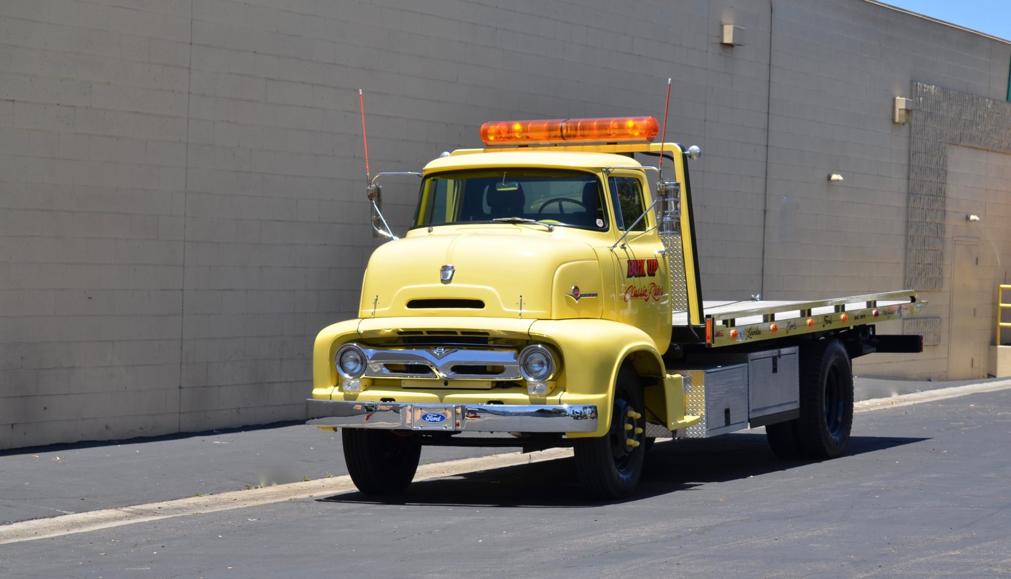 This custom 1956 Ford C-600 COE hauler features a stretched frame with a Chevron Century aluminum flatbed, finished in striking yellow with 'Bux Up Classic Rides' graphics. It is powered by a rebuilt 390ci V8 and equipped with a range of features including power brakes, power steering, modern air-conditioning, and leather-clad bucket seats for a comfortable ride.