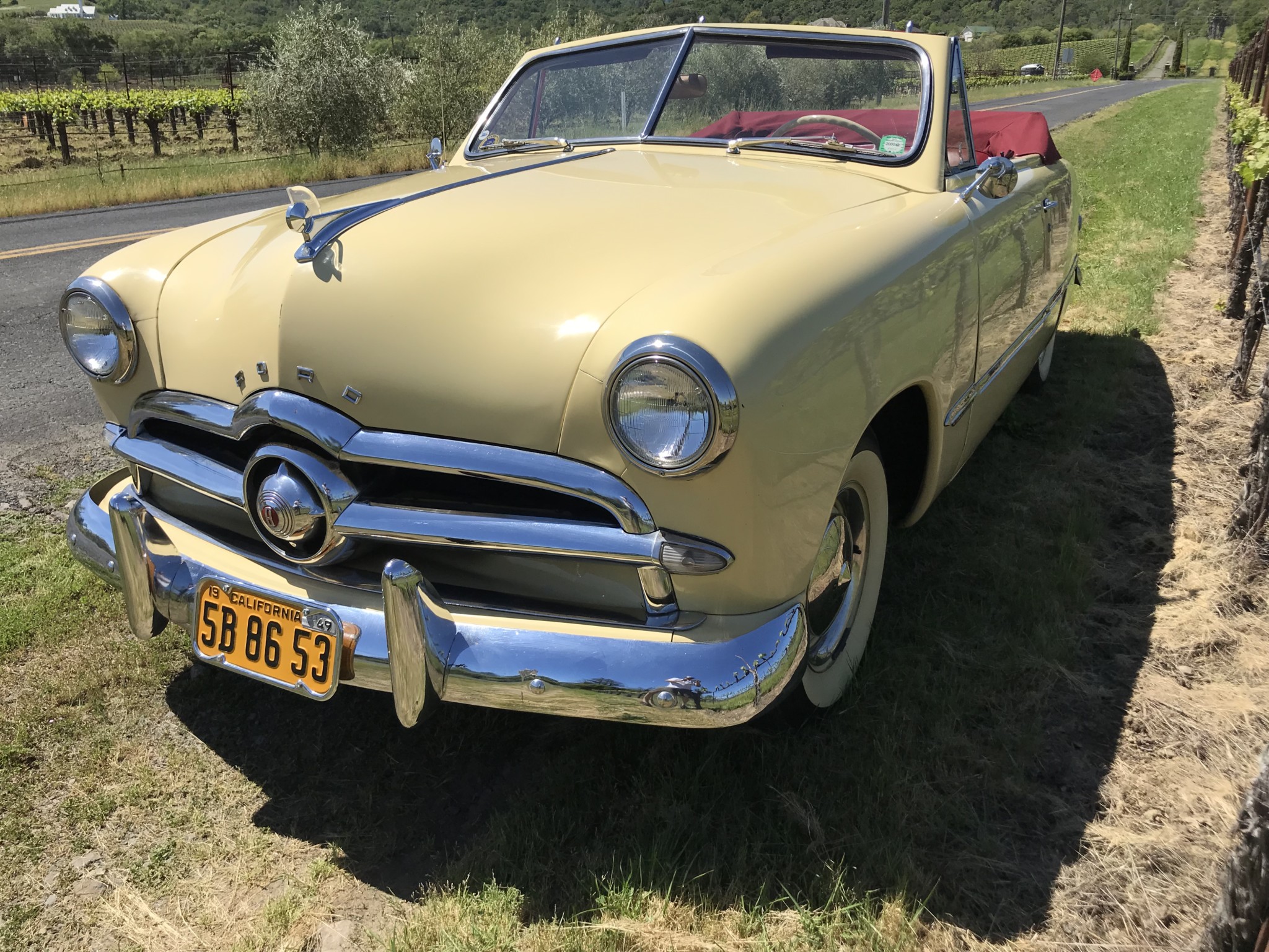 This classic 1949 Ford Custom Convertible stands out with its vibrant yellow paint, complemented by a burgundy soft top and a charming brown and red interior. Equipped with a 239ci flathead V8, the car features period-correct details like fender skirts and wide-whitewall tires, maintaining its vintage appeal.