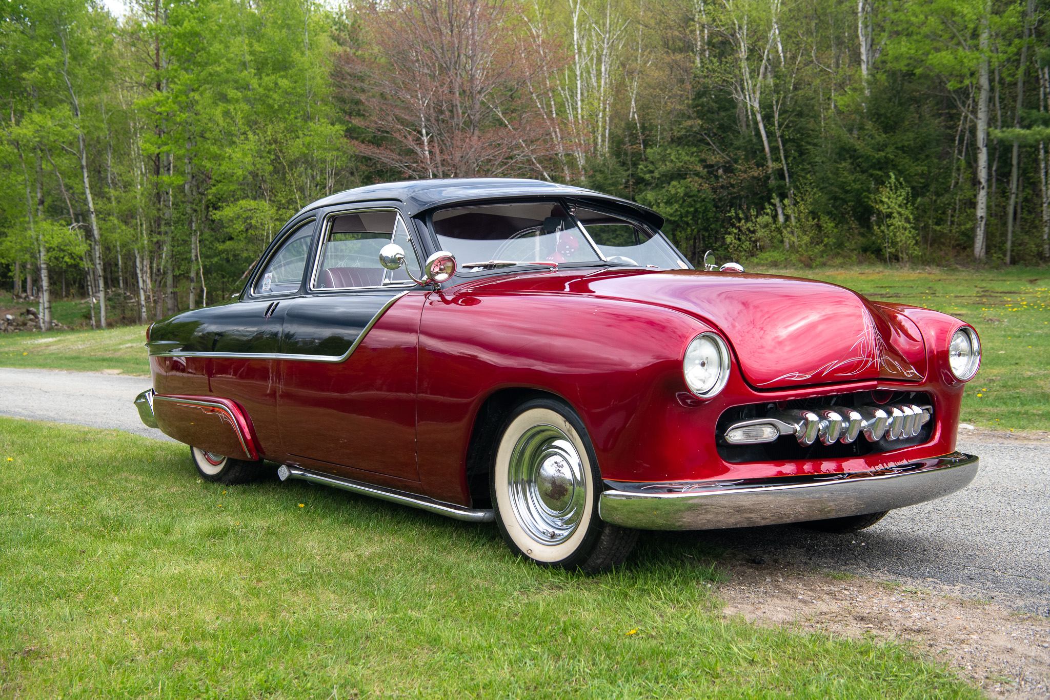 This custom 1949 Ford Tudor Coupe exudes classic Americana with its blend of maroon and black paint and vintage touches like a DeSoto grille, Pontiac side trim, and Packard taillights. The coupe features retro styling elements such as a roof visor, split windshield, and dual spotlights paired with chrome 15-inch wheels wrapped in wide whitewall tires. Inside, the maroon and white interior adds to the nostalgic vibe, powered by a 239ci V8 with dual Stromberg carburetors.