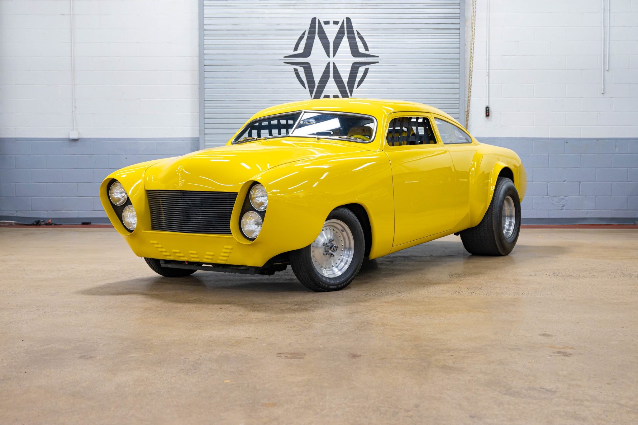 This vibrant yellow 1951 Ford Tudor Sedan exemplifies classic custom car culture with its dramatic chopped roof and tunneled headlights. Powered by a 440ci Chrysler V8, it features extensive modifications including a Mustang II-style front subframe and custom bodywork, giving it a unique hot rod character.