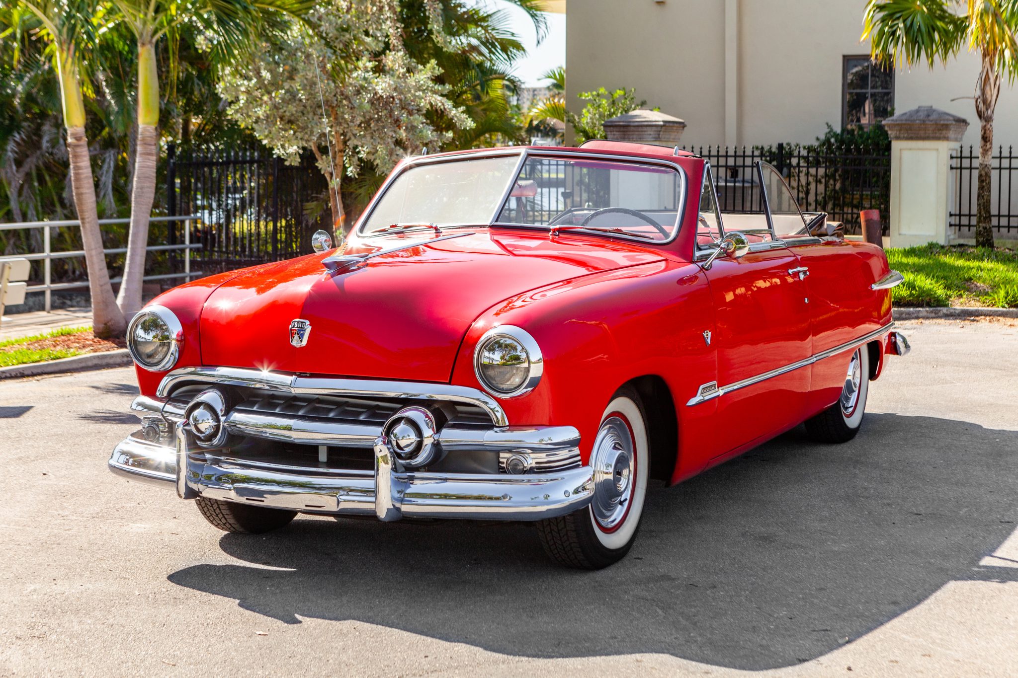 This 1951 Ford Custom Convertible presents a classic American style with its vibrant red paint, matching red and tan interior, and desirable features like the 239ci flathead V8 and tan soft top. The car retains period charm with enhancements such as Offenhauser ribbed aluminum heads and a 12-volt electrical conversion.
