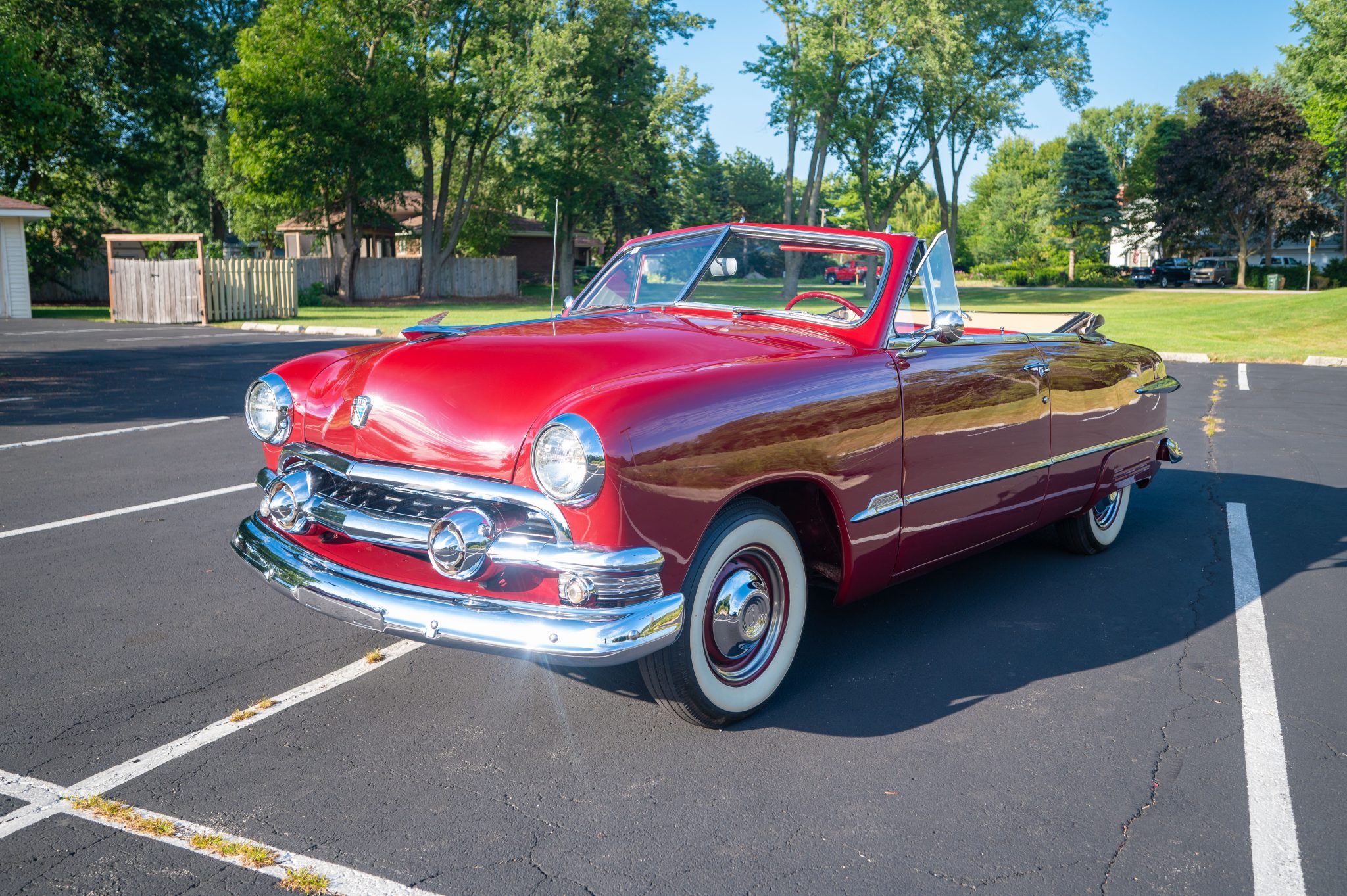 This classic 1951 Ford Custom Deluxe convertible boasts a striking red finish paired with a beige soft top, embodying the quintessential 1950s American style. Under the hood, a 239ci flathead V8 delivers power, complemented by a three-speed Ford-O-Matic transmission. With its red and white interior, body-color wheels, and chrome detailing, it encapsulates vintage charm and elegance.