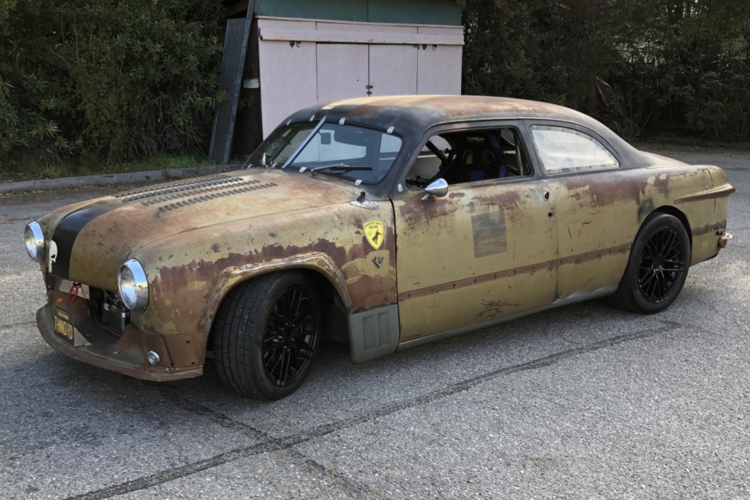 This 1951 Ford Custom Hot Rod features a unique blend of vintage and modern elements with a stretched 1985 C4 Corvette chassis, a vibrant yet faded yellow paint, and a striking black center stripe. The car's aggressive chopped roof and custom rear diffuser complement its distinctive patina, making it a stand-out rat rod-like creation.
