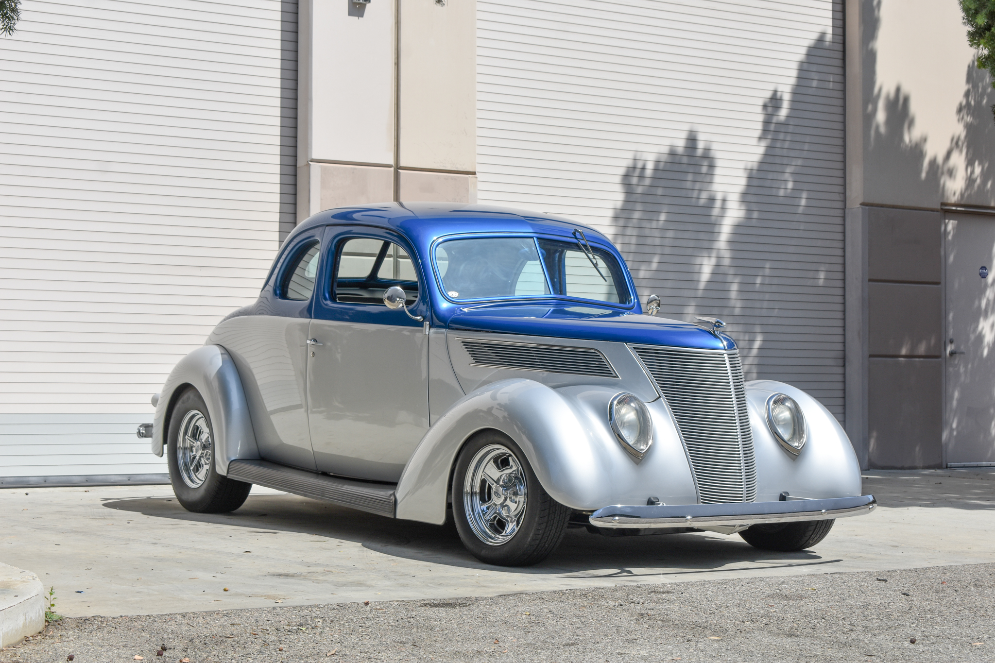 This 1937 Ford Coupe, finished in striking two-tone blue and silver, features a hot rod aesthetic with a 350ci GM V8, Mustang II front suspension, and 15" Cragar wheels. Blending vintage charm with modern modifications, it offers a distinctive look with chrome details and power features.