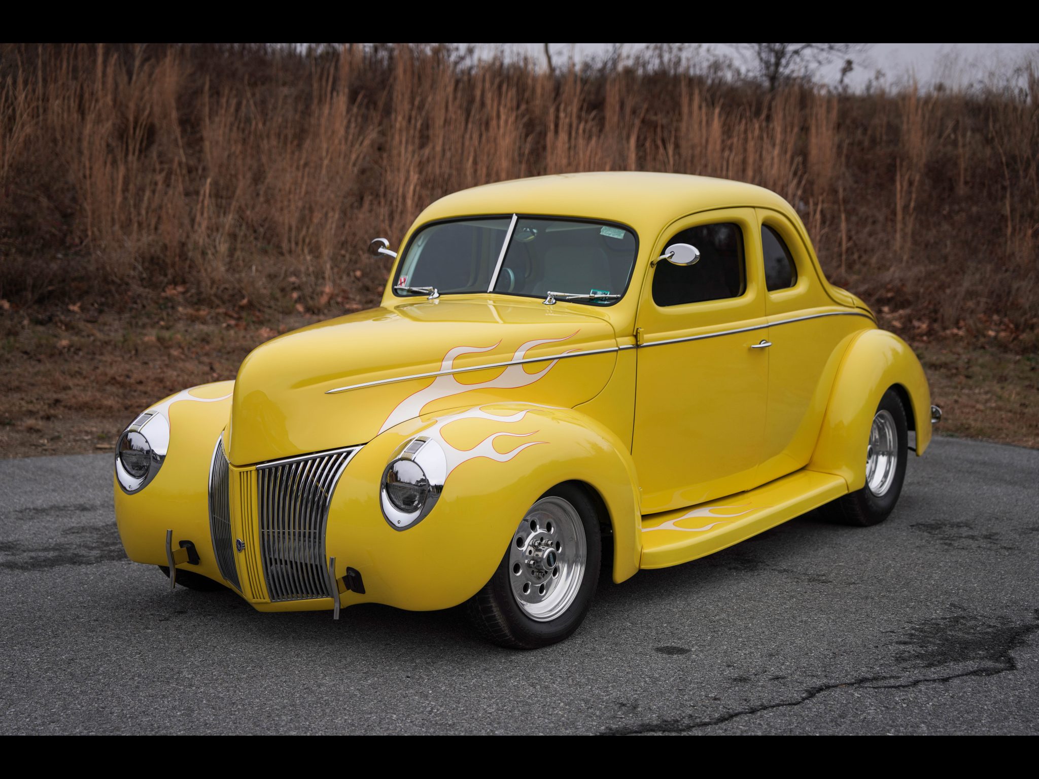 This vibrant 1940 Ford Coupe is a striking street rod, showcasing a yellow paint scheme accented with flames. Powered by a bored 468ci V8, it features a Mustang II-style front end with polished Cragar alloys and a custom, color-coordinated interior fitted with modern amenities.