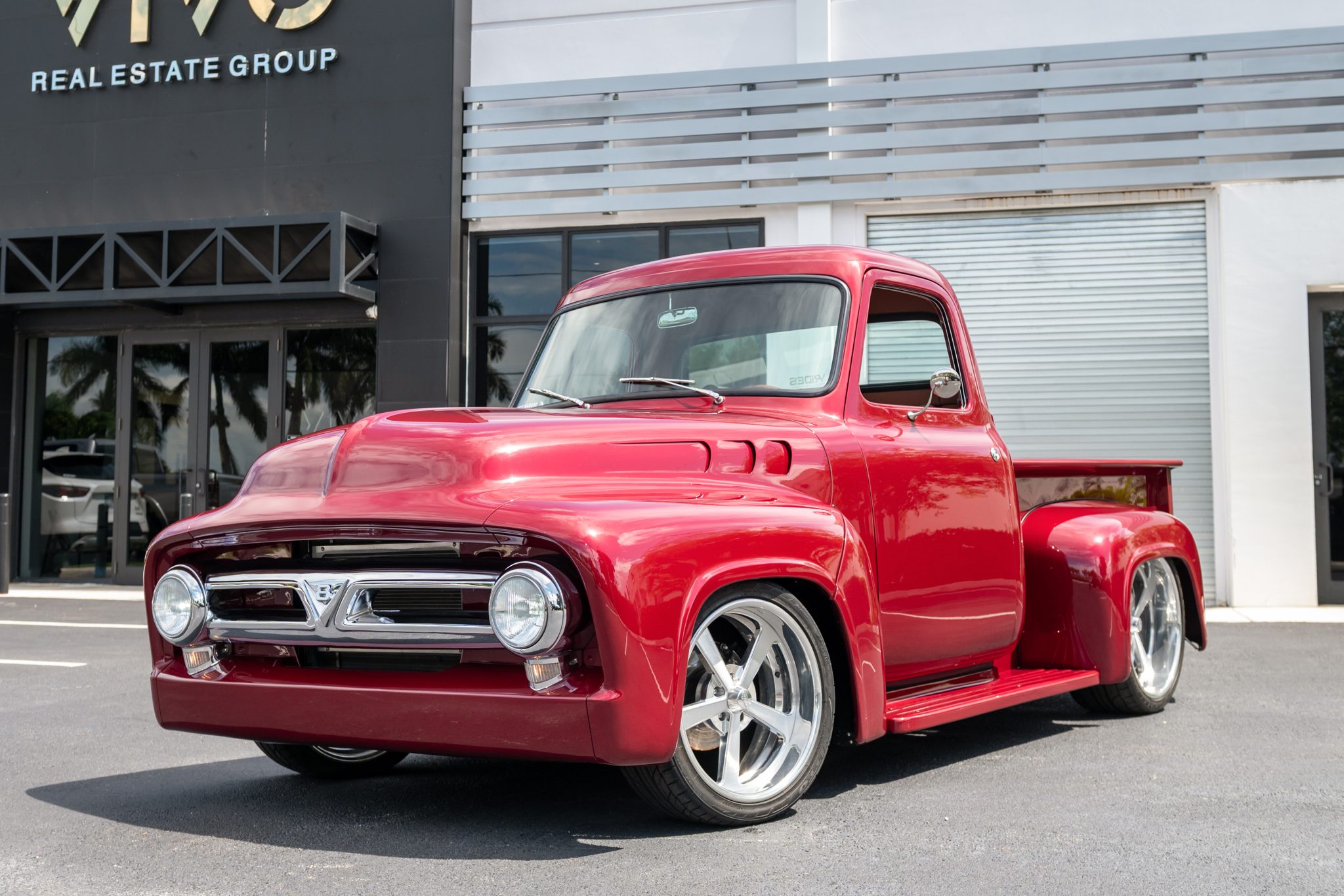 This striking 1954 Ford F-100 is a masterfully crafted custom build featuring a dark red finish, widened rear fenders, and a power-operated forward-tilting front end. With a 350ci V8 engine, smooth tailgate, custom hood vents, and distinct Intro billet wheels, the truck embodies both classic appeal and modern modifications.