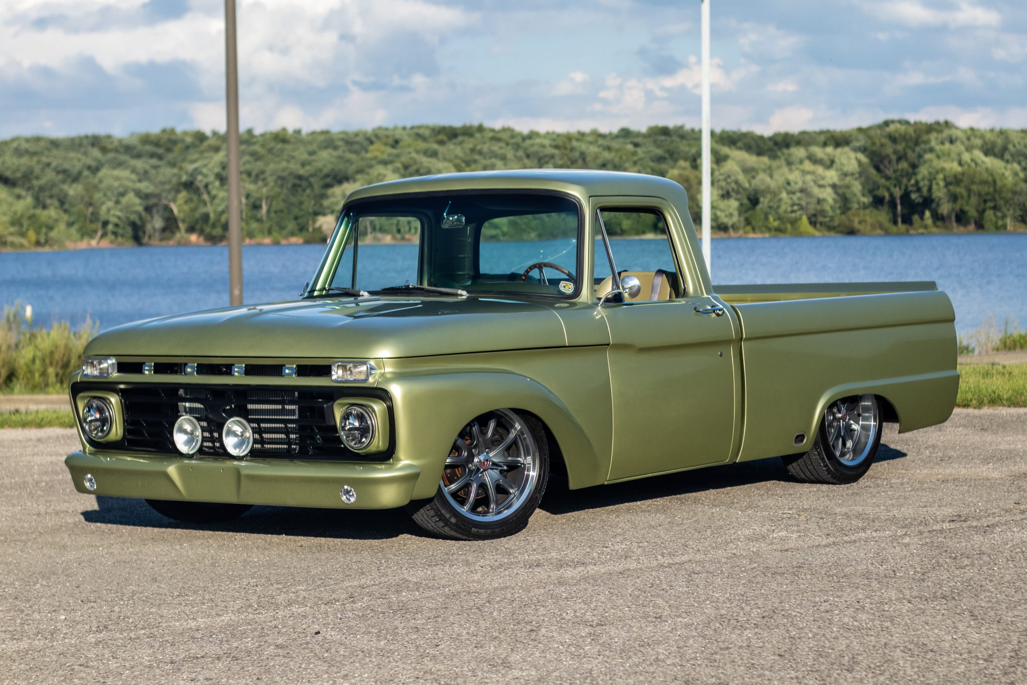 This striking Legend Lime Metallic 1966 Ford F-100 features a robust 445ci stroker V8 under the hood, paired with a Tremec five-speed manual transmission for spirited driving. With modified bodywork including widened fenders and a wood-lined cargo floor, it's equipped for both performance and style. Modern touches include independent suspension, power disc brakes, and a custom interior with green vinyl upholstery.