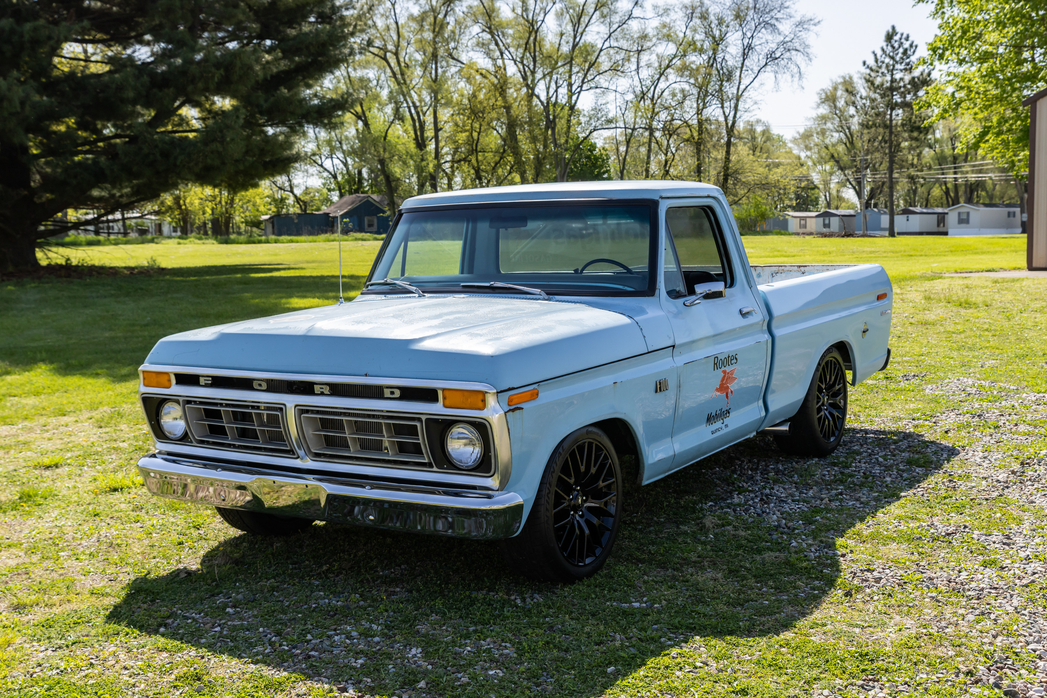 This 1974 Ford F-100 Custom was built with a Mustang-sourced 4.6-liter 3-valve V8 engine, coupled with a five-speed automatic transmission and a 2003 Mustang GT-sourced 8.8″ rear axle with 3.27:1 gearing. It features a Crown Victoria front suspension setup with Ridetech coilovers and power-assisted rack-and-pinion steering. The body sports a weathered blue paint finish with Mobilgas branding, and it rides on 19-inch black alloy wheels. Additional upgrades include an aluminum radiator, power-assisted disc brakes, and a re-trimmed blue interior with a JVC stereo and Intellitronix digital gauges.