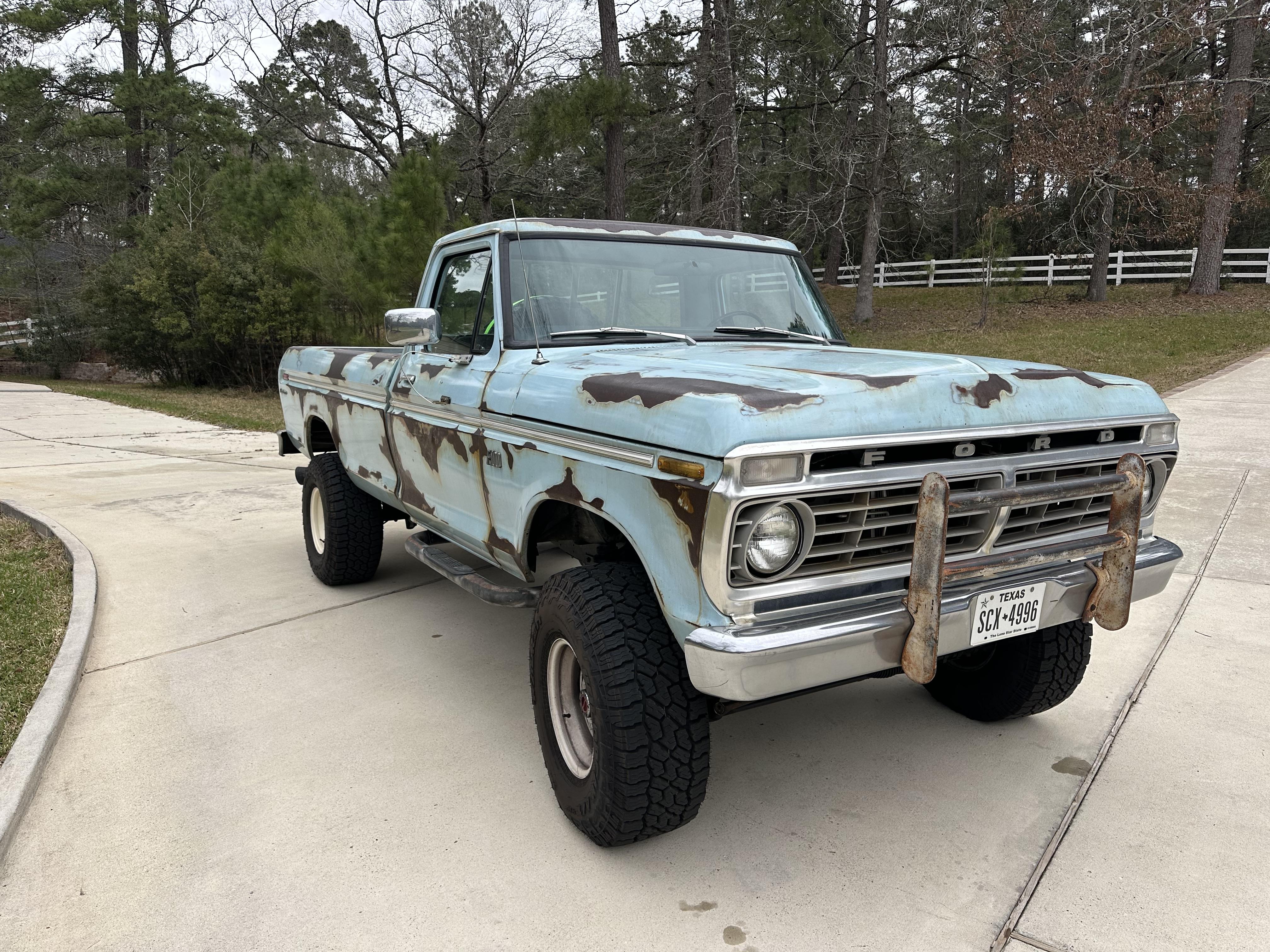 This 1974 Ford F-100 Custom features a rough and patinated light blue paint finish. It is powered by a 300ci inline-six engine equipped with Holley Sniper electronic fuel injection, an Aussiespeed intake manifold, and a Hedman exhaust header. The truck includes a Tremec TR-4050 five-speed manual transmission and a dual-range transfer case, offering 4x4 capabilities. Additional features include a Rough Country 2.5-inch suspension lift, front disc brakes, air conditioning, and a vintage-look radio. The truck rides on 15-inch white steel wheels with Falken Wildpeak tires and is offered with a Texas title.