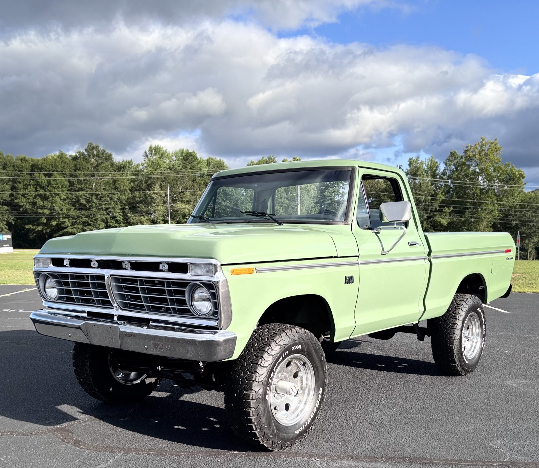 This 1975 Ford F-100 Custom 4×4 underwent a comprehensive refurbishment that included a fresh green paint job, a black vinyl interior reupholster, and a rebuild of the 300ci inline-six engine along with the four-speed manual transmission and dual-range transfer case. Notable features include 17-inch polished alloy wheels, Wilwood disc brakes, a suspension lift, and a custom dual exhaust system. The truck also sports chrome bumpers, a bright grille, dual folding side mirrors, and aftermarket climate control, although the air conditioning is currently non-functional.
