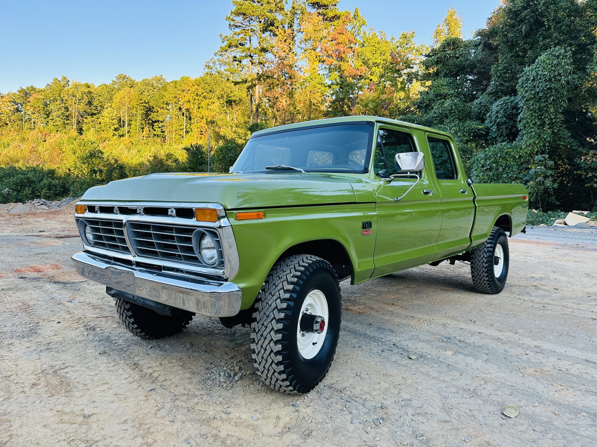 This 1974 Ford F-250 Custom Crew Cab 4×4 from Ford's F-Series is a well-maintained example with recent updates including a transmission rebuild, a repaint in green, and various servicing tasks. It's powered by a 390ci V8 engine paired with a three-speed automatic transmission. Notable features include an Edelbrock carburetor, manually locking front hubs, chrome bumpers, towing mirrors, a spray-in bedliner, and 16-inch alloy wheels with Prinx Hi Country M/T tires. The interior is furnished with green vinyl upholstery and features a retro-look stereo and air conditioning. Originally registered in Texas, the truck is now located in New York and comes with a Deluxe Marti report, a window sticker, service records, and a clean Texas title. This 1974 Ford F-250 Custom Crew Cab Highboy 4x4 was delivered new to Texas and refurbished with a metallic green repaint and refreshed interior. It features a 390ci V8, replacing the original 360ci, paired with a three-speed automatic transmission and a dual-range transfer case, both rebuilt. It includes manually locking front hubs, power steering and brakes, air conditioning, a retro digital radio with Bluetooth, and a spray-on bed liner. Further modifications include a dual exhaust system, re-trimmed two-tone green vinyl benches, and refinished 16" steel wheels with new tires.