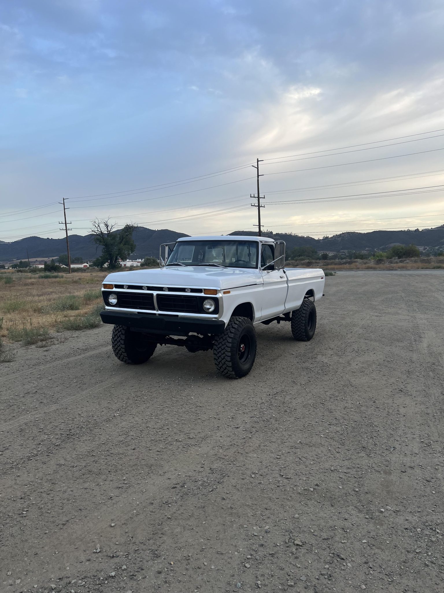 This 1974 Ford F-250 Custom Highboy 4x4 is equipped with a 360ci V8 engine fitted with a Holley Brawler Street carburetor, Edelbrock intake manifold, and long-tube exhaust headers. The truck features a four-speed manual transmission with a divorced dual-range transfer case and a limited-slip rear differential. It is finished in white with brown vinyl upholstery and includes modifications such as 16" steel wheels with Falken Wildpeak M/T tires, a bed-mounted fuel tank and tool stowage box, dual towing mirrors, and an aftermarket rear bumper with LED cube lights. The suspension is enhanced with Skyjacker shock absorbers. This vehicle was initially delivered to Abbott Ford in La Puente, California and is accompanied by an Elite Marti Report and a reproduction window sticker.