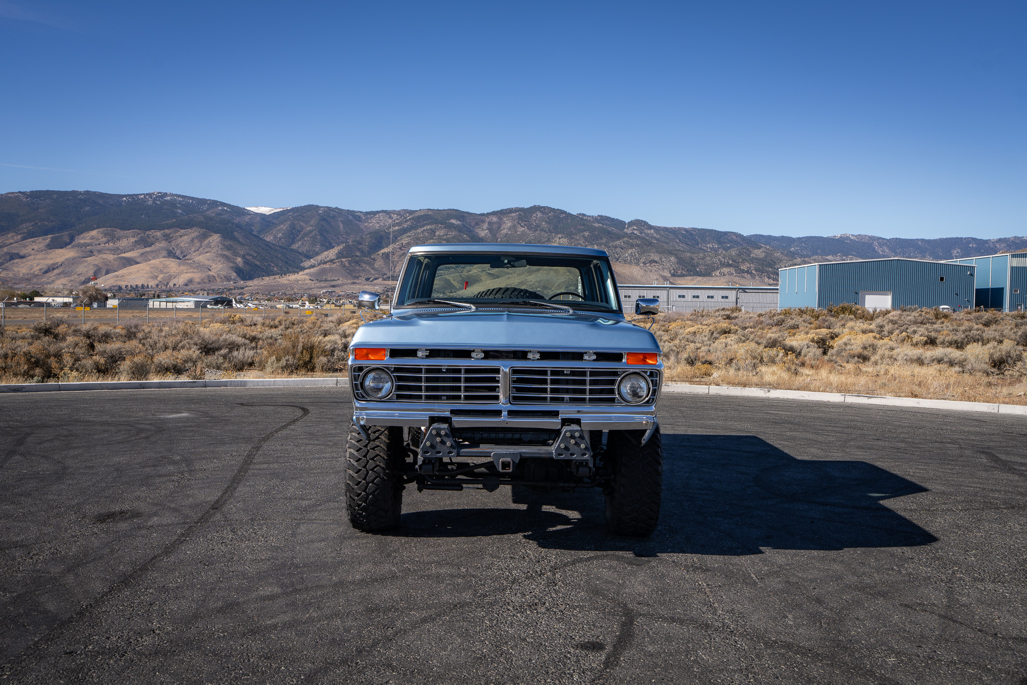 This 1975 Ford F-250 Custom 4×4 has been modified with a rebuilt 460ci V8 engine paired with a three-speed automatic transmission and a dual-range transfer case. The truck is finished in Light Grabber Blue and features a suspension lift, 16'' aluminum wheels with Maxxis Razr M/T tires, and late-model F250 axles. Enhancements include a QuickFuel carburetor, Edelbrock cylinder heads, long-tube headers, and Rancho RS5000 shocks. The interior has been updated with blue vinyl and cloth upholstery, a retro-style digital stereo, and aftermarket speakers.