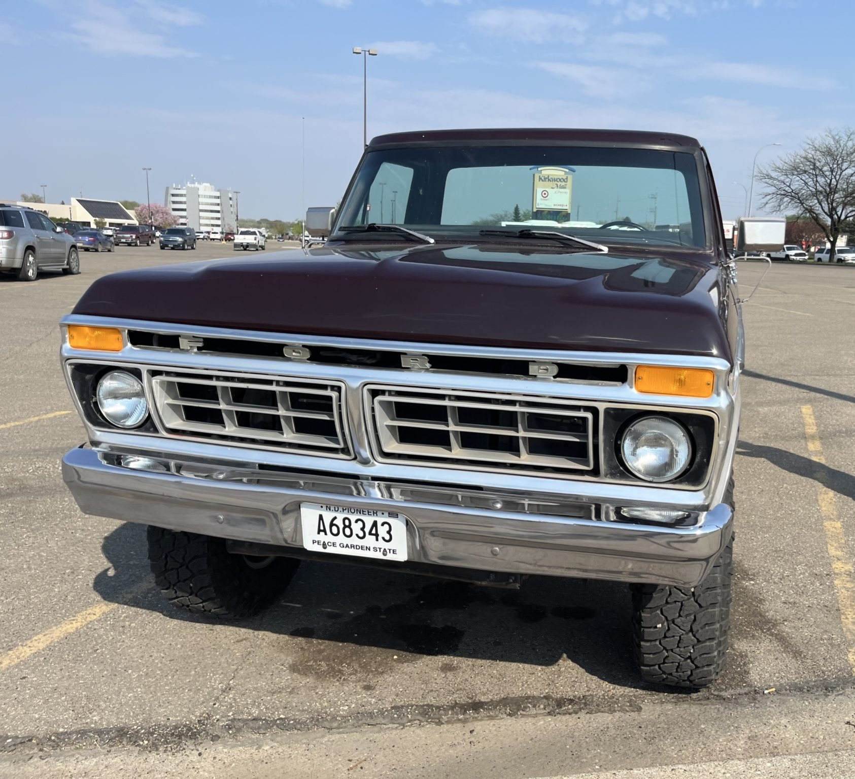 This 1975 Ford F-250 Custom 4×4 was refurbished by the seller in 2023. The truck features a repainted maroon and gray exterior and several mechanical upgrades. It is powered by a 360ci V8 paired with a four-speed manual transmission and a dual-range transfer case. Key modifications include a rear cap with sliding windows, 16-inch American Racing wheels with 285/75 Kelly Edge MT tires, power steering, and power front disc brakes. The interior has been updated with gray cloth and vinyl upholstery. The truck is offered with a Deluxe Marti report and refurbishment photos.