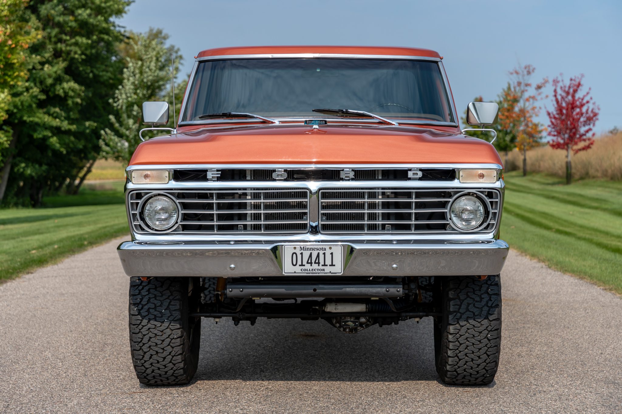 This 1975 Ford F-250 Custom Explorer was repainted in Copper Metallic and fitted with a rebuilt 390ci V8 engine in 2022. The truck features a four-speed manual transmission, dual-range transfer case, and a limited-slip rear axle. Enhancements include 17" American Racing polished alloy wheels, ceramic-coated headers, a dual exhaust system, an Edelbrock carburetor, and a suspension lift kit. The interior sports a tan vinyl bench seat, aftermarket digital stereo, and steering damper. Exterior features include a chrome grille, chrome rear bumper, white accent stripe, and tinted windows. The vehicle comes with service records and shop manuals.