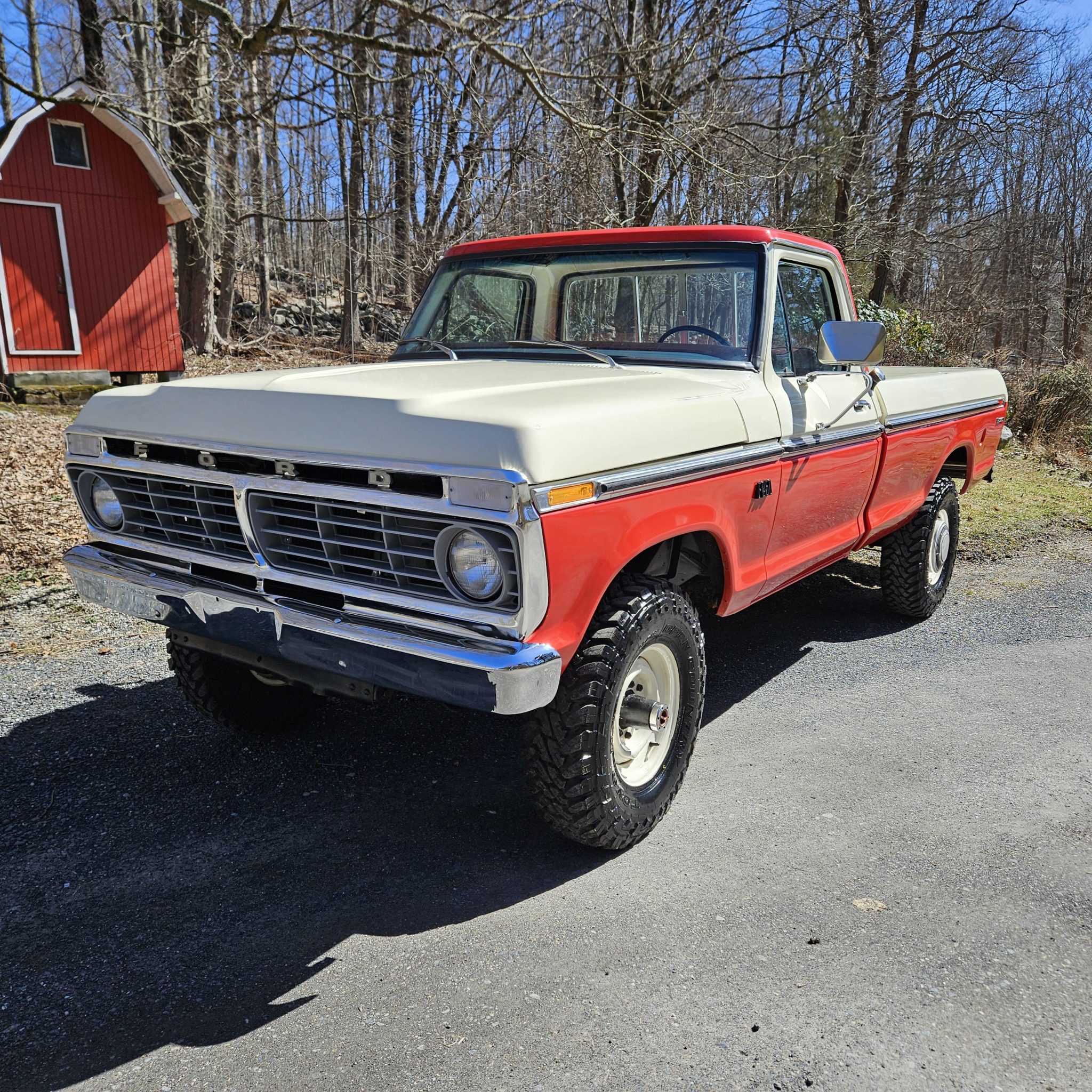 This 1975 Ford F-250 Custom Highboy features a 360ci V8 engine paired with an Edelbrock carburetor, driving a four-speed manual transmission and a dual-range transfer case. The truck boasts a newly repainted body in red and white, with original Wimbleton White and Viking Red factory colors. Key features include a Styleside cargo bed, chrome bumpers, and white-finished 16" steel wheels with Toyo Open Country M/T tires. It also has a red vinyl-upholstered bench seat, power steering, and four-wheel drum brakes. This vehicle, previously located in Oregon, is now offered with a Deluxe Marti report and a clean Oregon title.