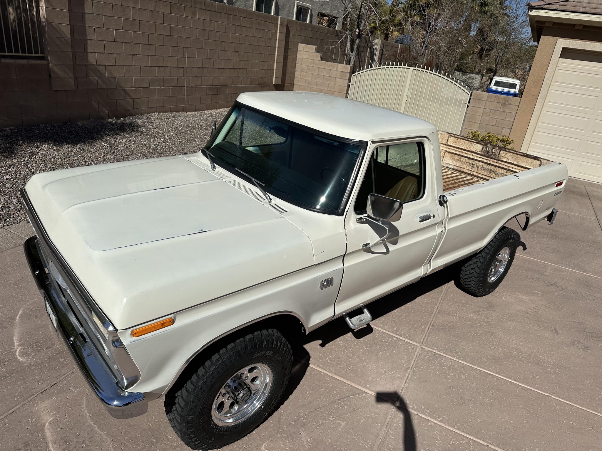 This 1975 Ford F-250 Custom Highboy 4x4 features a rebuilt 390ci V8 engine with a Holley four-barrel carburetor, coupled to a four-speed NP435 manual transmission. The truck has undergone a mechanical and interior refurbishment from 2011 to 2015, which included upgrades such as a dual exhaust system, Rancho RS5000X shock absorbers, and 16-inch American Eagle aluminum wheels with Falken Wildpeak M/T tires. Finished in Wimbledon White over tan vinyl upholstery, it has a partially repainted exterior with some evidence of body filler. Notable features include a vintage-style aftermarket stereo, air conditioning, and a receiver hitch. It is offered with service records, a Deluxe Marti report, and a Nevada title.