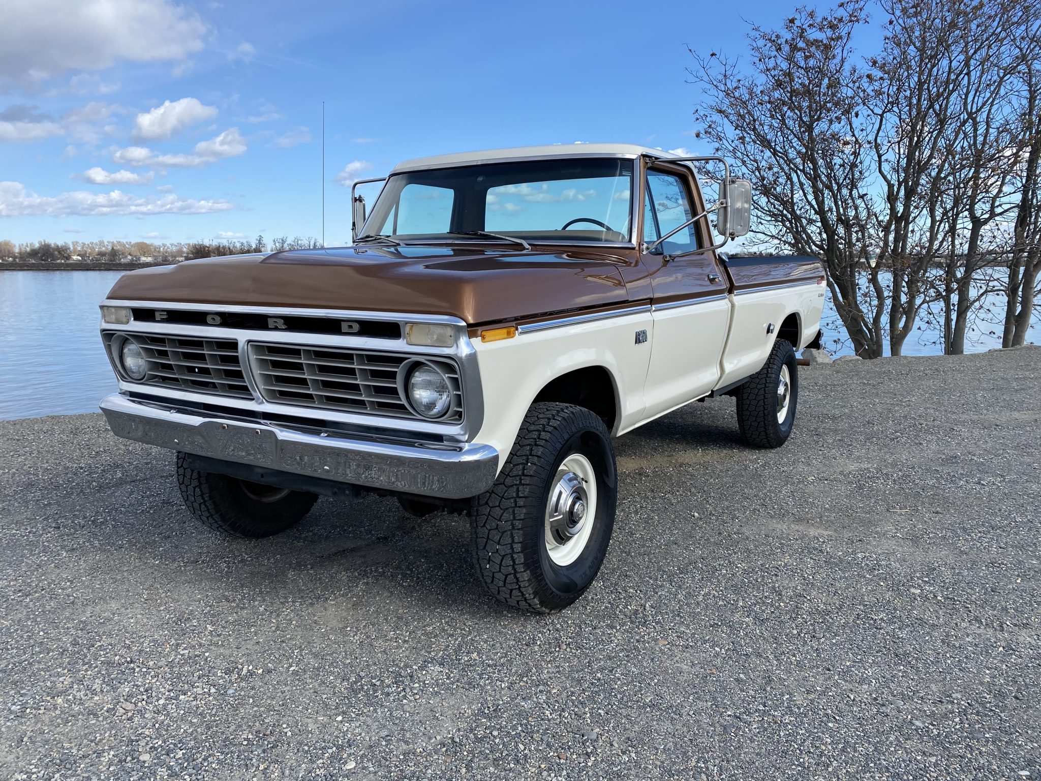 This 1975 Ford F-250 Highboy Custom is a regular-cab 4x4 pickup, finished in two-tone Wimbledon White and Sequoia Brown over a brown interior. It is powered by a 360ci V8 engine mated to a three-speed automatic transmission and a two-speed transfer case. The truck features polished bumpers and trim, dual towing mirrors, and a spray-in bedliner. Additional amenities include a Philco push-button radio and a defroster. The truck's 16” steel wheels are mounted with Corsa All Terrain XL tires, and the front axle has manually-locking hubs. It was repainted during the current ownership and is offered with a clean Washington State title.