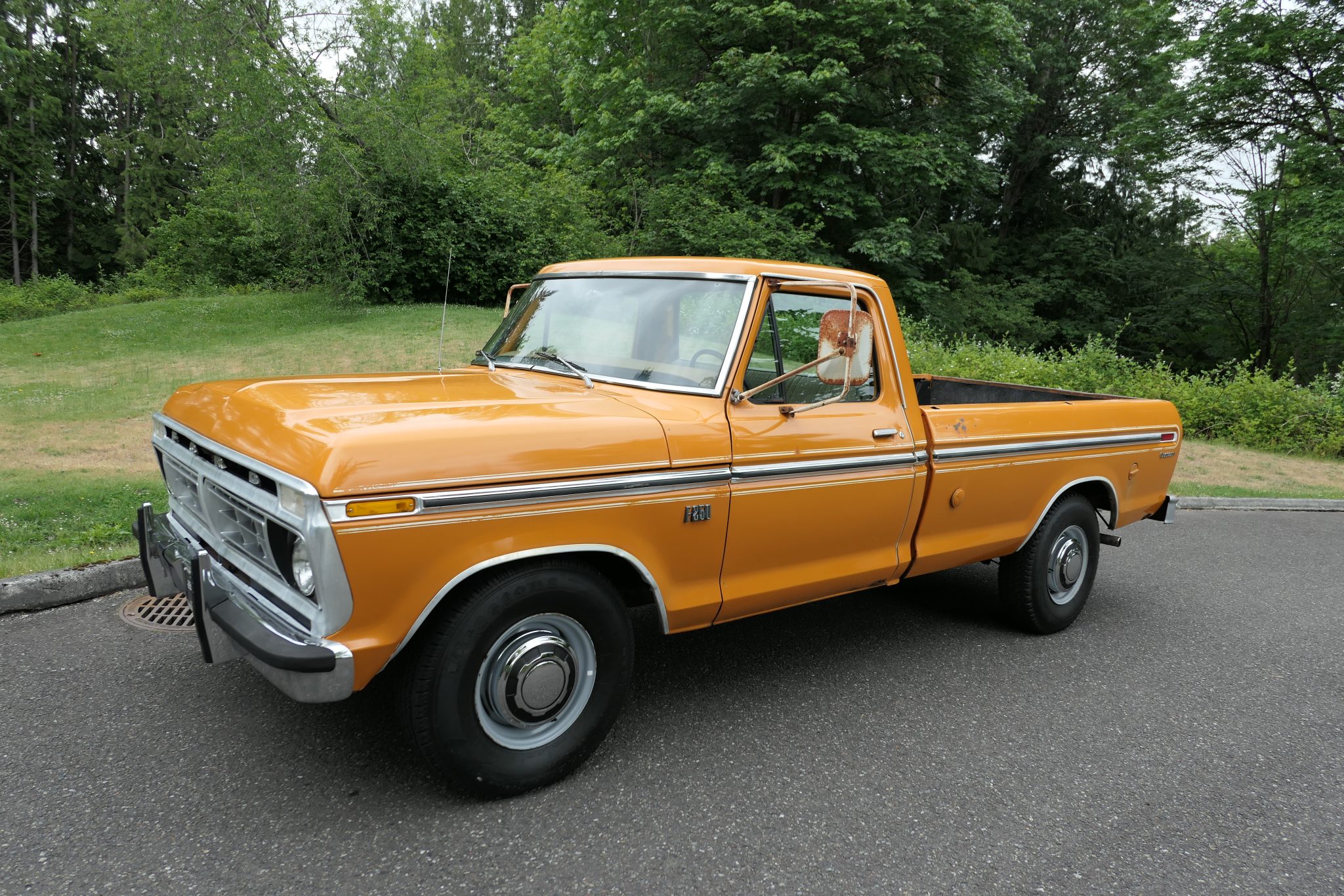 This 1976 Ford F-250 Custom is a two-wheel-drive regular-cab pickup, originally delivered to Marv Tonkin Ford in Portland, Oregon. It features a 360ci V8 engine paired with a four-speed manual transmission and a limited-slip differential. Recent updates include a new fuel pump, alternator, starter motor, starter solenoid, battery cables, belts, and ignition components. The truck is finished in orange and features a Styleside bed, power steering, power front disc brakes, dual towing mirrors, and an aftermarket dual exhaust system. It rides on 16-inch steel wheels with Firestone tires. This 1976 Ford F-250 Custom pickup is equipped with a 360ci V8 engine and a four-speed manual transmission. It features power steering, power front disc brakes, and a limited-slip differential. The truck is finished in orange with a tan cloth interior and includes dual towing mirrors, a Styleside bed, a rear step bumper, and a ball hitch. It rides on 16-inch steel wheels with Firestone tires and underwent recent maintenance including the replacement of several engine components.