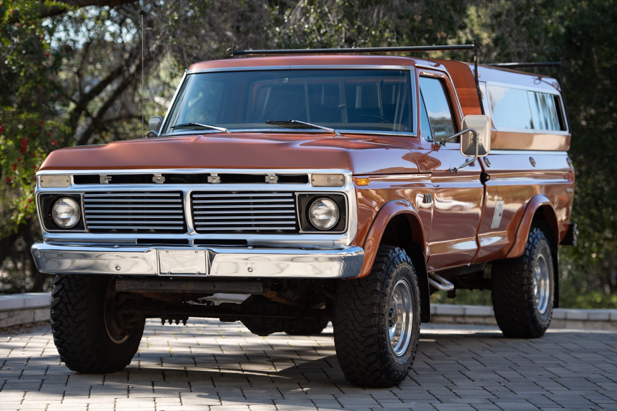 This 1976 Ford F-250 Custom is a regular-cab 4x4 pickup finished in Copper Metallic. It is equipped with a 360ci V8 engine mated to a four-speed manual transmission, a dual-range transfer case, and a Dana 60 locking rear axle. Notable features include a suspension lift kit, 16-inch Ultra wheels, and a body-color hard-shell bed cap. The interior features brown vinyl upholstery with cloth inserts. The truck comes with a Deluxe Marti report and a clean Oregon title.
