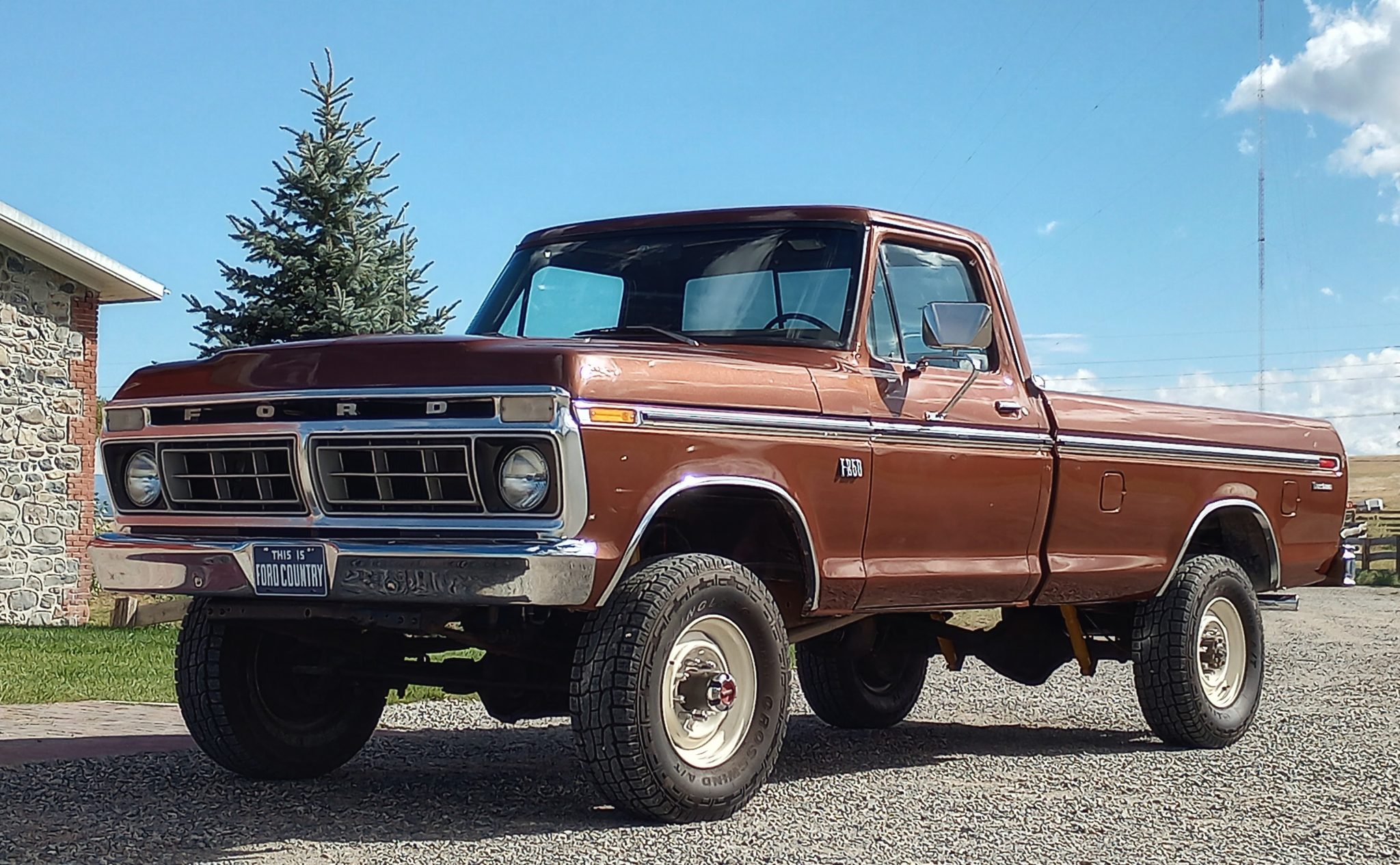 This 1976 Ford F-250 Custom Highboy is powered by a 428ci V8 engine installed in 2002, paired with a four-speed manual transmission and dual-range transfer case. Originally finished in Ginger Glow, the truck was repainted in 2007. Features include 16" white-painted steel wheels, chrome bumpers, aftermarket exhaust headers, and a custom dual exhaust system. The interior is outfitted with tan vinyl and velour upholstery, an Alpine cassette head unit, and aftermarket speakers. It has been well-maintained with records including a Deluxe Marti Report.