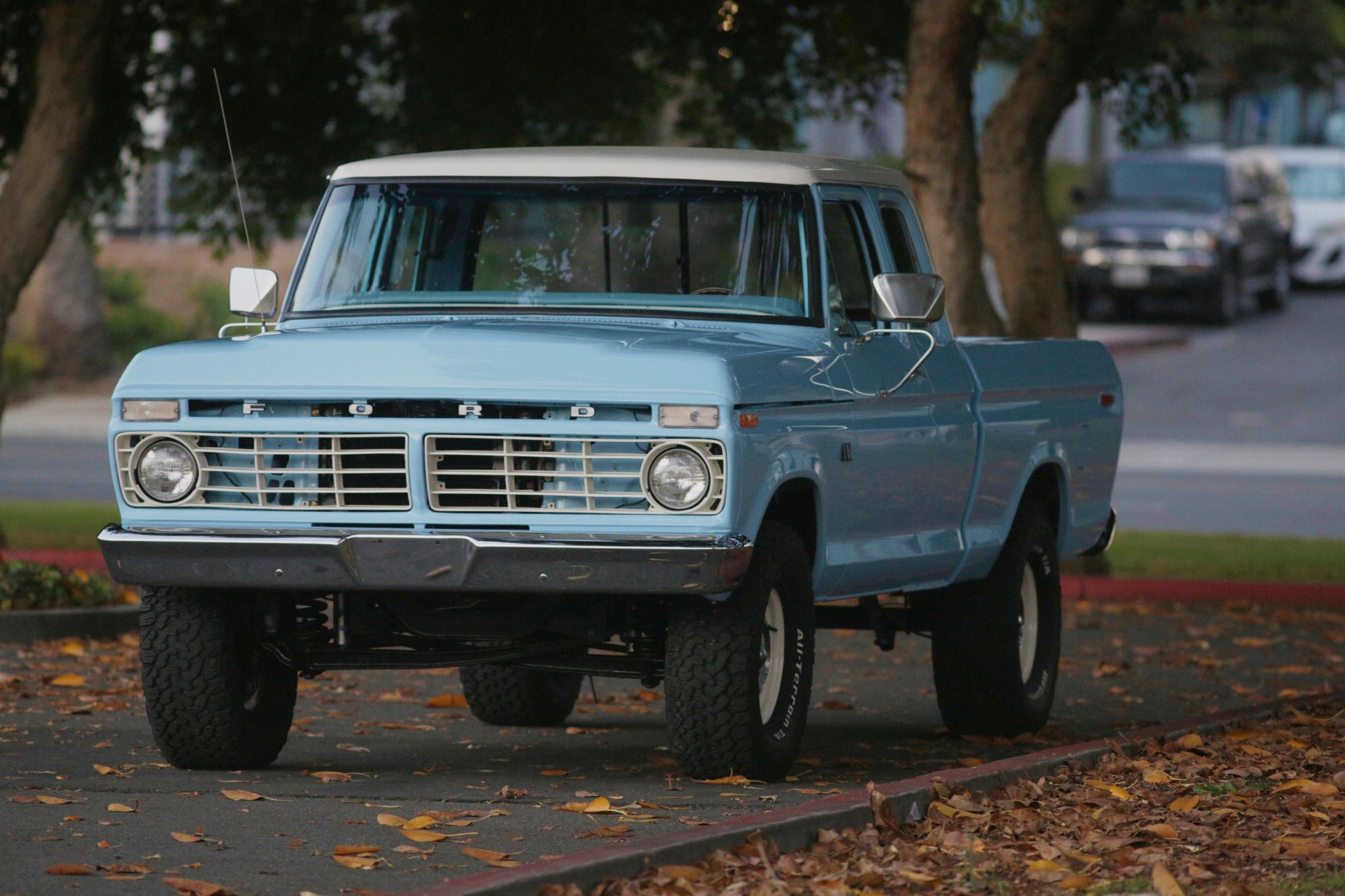 This 1975 Ford F-150 Custom SuperCab has been refurbished with care, showcasing a stunning Wind Blue exterior with a Wimbledon White cab top. The truck underwent a meticulous restoration, including a rebuilt 360ci V8 engine with a mild RV camshaft and an Edelbrock 1406 four-barrel carburetor, paired with a rebuilt C6 three-speed automatic transmission. The suspension received a 3.5” Autofab lift, complemented by new I-beam and radius arm bushings. It features 15-inch steel wheels mounted with BFGoodrich All Terrain tires. Additional upgrades include power steering, power-assisted front disc brakes, Bilstein shocks, air conditioning, and an aftermarket stereo. The interior boasts retrimmed blue cloth and fabric upholstery with updated carpets, enhancing both comfort and style.