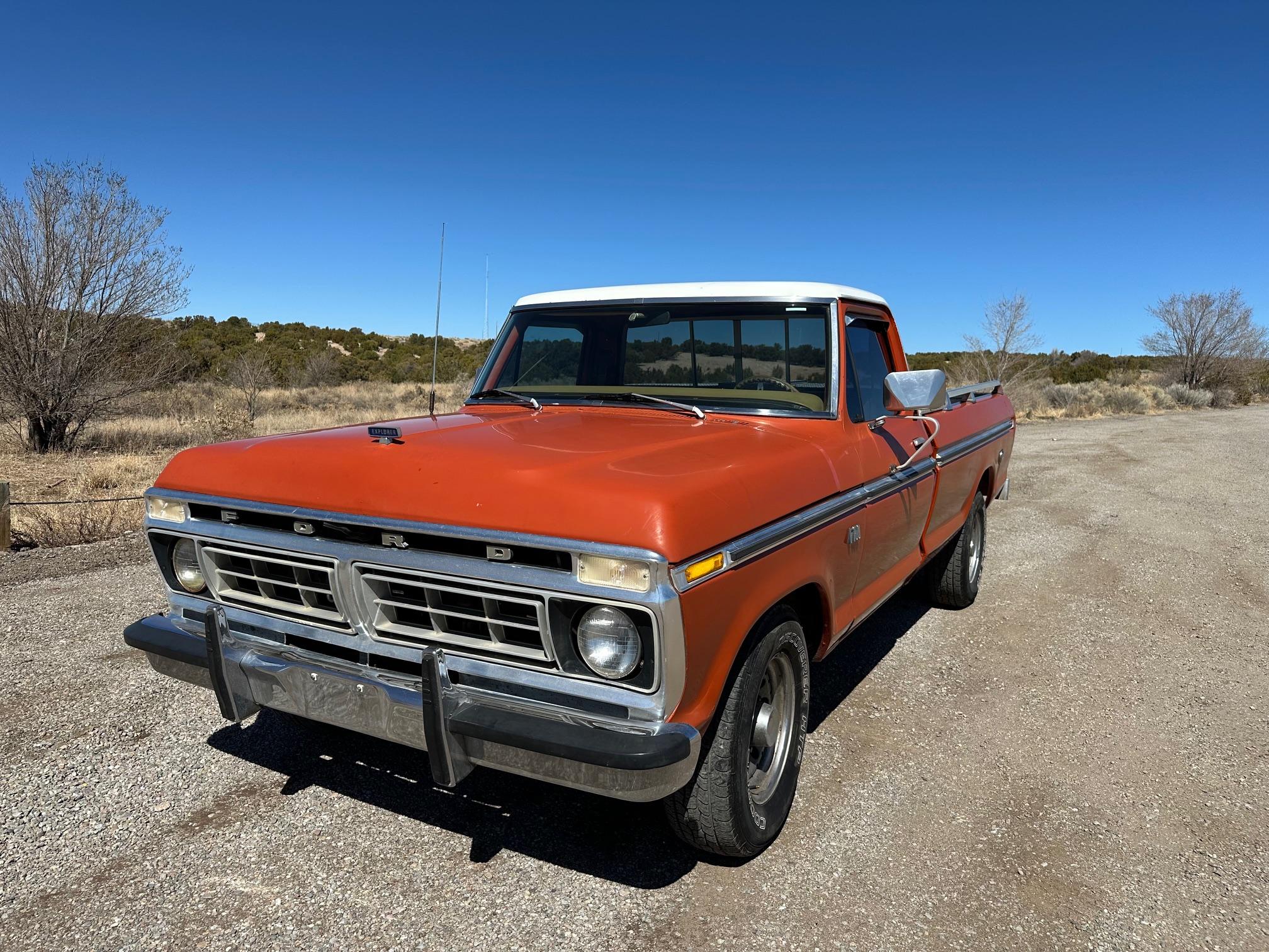 This 1976 Ford F-150 Special Custom is a two-wheel drive, regular cab pickup featuring a 390ci V8 engine paired with a three-speed automatic transmission and a Dana 61 axle. Finished in Medium Copper with a Wimbledon White roof, the truck includes bright bodyside moldings, a spray-on bedliner, and locking diamond-plate storage box. Interior features involve a tan vinyl and cloth bench seat, wood-rimmed steering wheel, and a custom audio system. Recent maintenance includes gasket replacements, new battery, ignition module, fuel filter, and hoses.