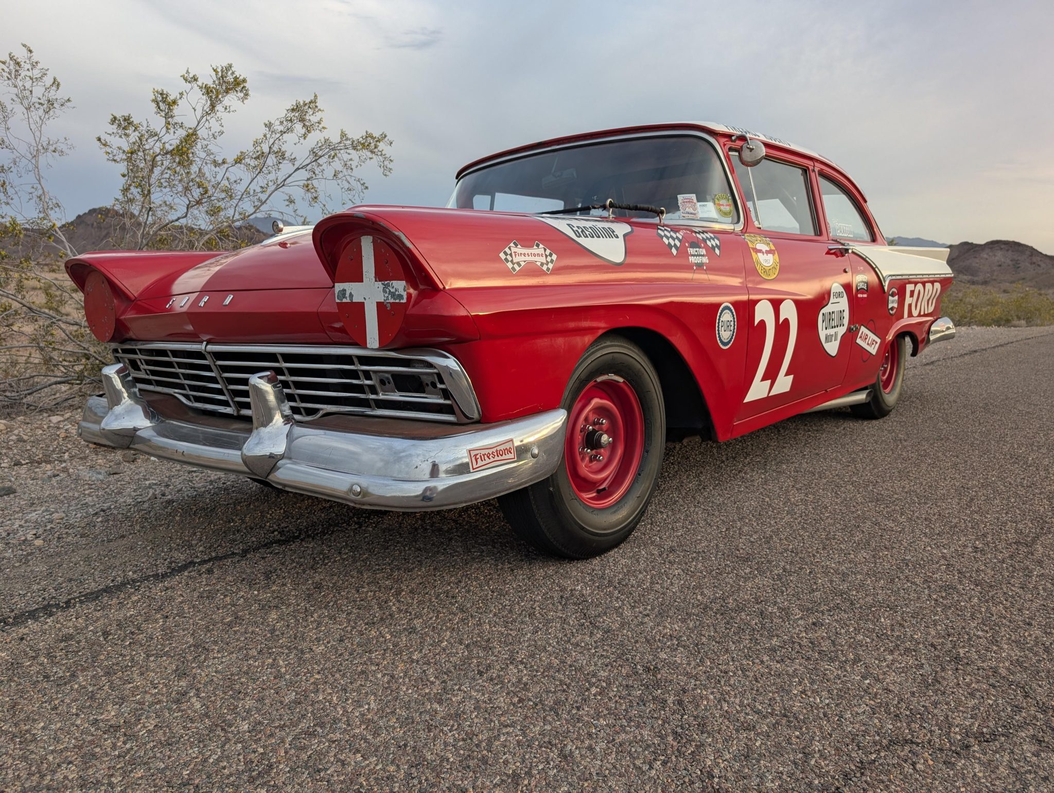 This 1957 Ford Fairlane, inspired by Glenn “Fireball” Roberts' Grand National NASCAR race car, sports a striking red and white #22 livery. It features a supercharged 312ci V8 engine, period-correct racing equipment, and bold NASCAR-style graphics, making it a nostalgic tribute to a legendary racing era.