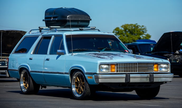This unique 1980 Ford Fairmont, nicknamed 'Fearmont', underwent a transformation using the running gear from a '95 Mustang Cobra. Built by Mark Savioa in just a week, the Fearmont features a 302ci Windsor engine with AFR heads, a Holley Sniper 2 EFI system, and a T5Z 5-speed transmission. The car is equipped with a factory A/C and a triple-pass radiator with Derale electric fans. Inside, it features seats from a New Edge Mustang, reupholstered to match the original blue interior. Mark and his family embarked on a 5,000-mile journey, showcasing the car's reliability at the 2023 Foxtober Fest.