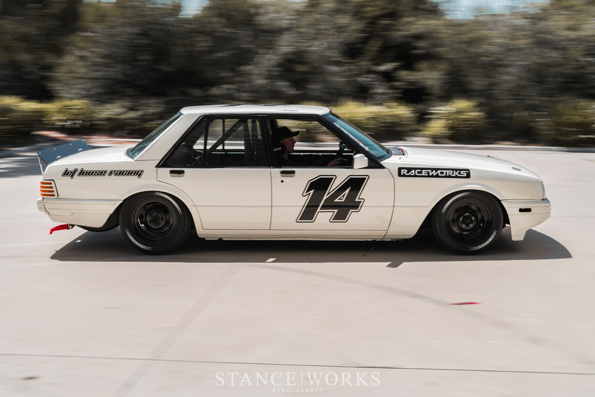 Matt Bomer's 1986 Ford XF Fairmont Ghia transforms a usually overlooked four-door sedan into a stunning vintage race car. Inspired by Trans Am aesthetics and equipped with Bassett Racing wheels wrapped in Hoosier slicks, this cream-colored Fairmont showcases a unique blend of understatement and bold racing flair.
