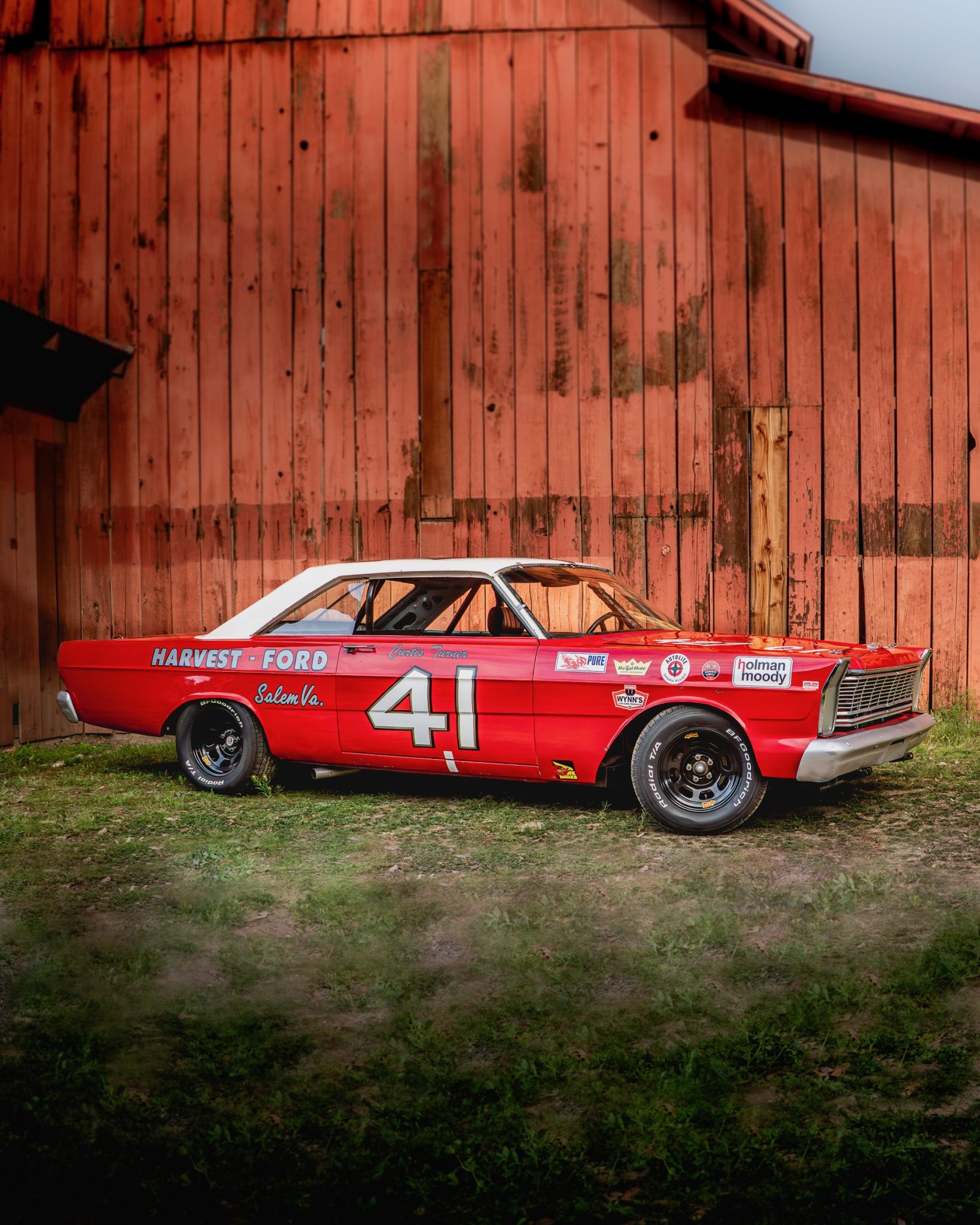 A striking 1965 Ford Galaxie 500 fastback transformed into a Curtis Turner-style race car, featuring a potent 427ci side-oiler V8 paired with a four-speed manual. Adorned with a race-inspired red and white livery, this track car is equipped with Aero steel wheels, custom suspension, and a roll cage for high-speed thrills.