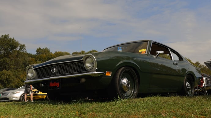 Bryant Althof’s 1970 Ford Maverick was a standout at the 2021 Holley Ford Festival, thanks to its Coyote engine swap. The car blends restomod sensibilities with a restoration-quality appearance, featuring suspension and brake upgrades.