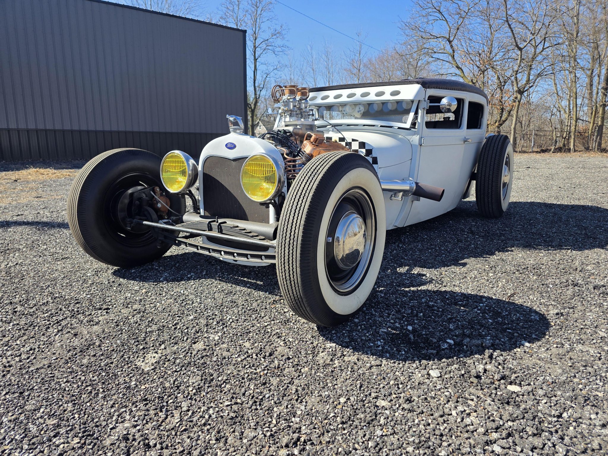 This 1928 Ford Model A Hot Rod showcases a chopped and channeled body finished in matte white, pairing vintage aesthetics with modern flair. It's powered by a 302ci V8 with a tunnel-ram intake and dual Holley carburetors, riding on 16" steel wheels with whitewall tires. The custom interior features diamond-stitched upholstery and bomber-style seats, enhancing its classic hot rod vibe.