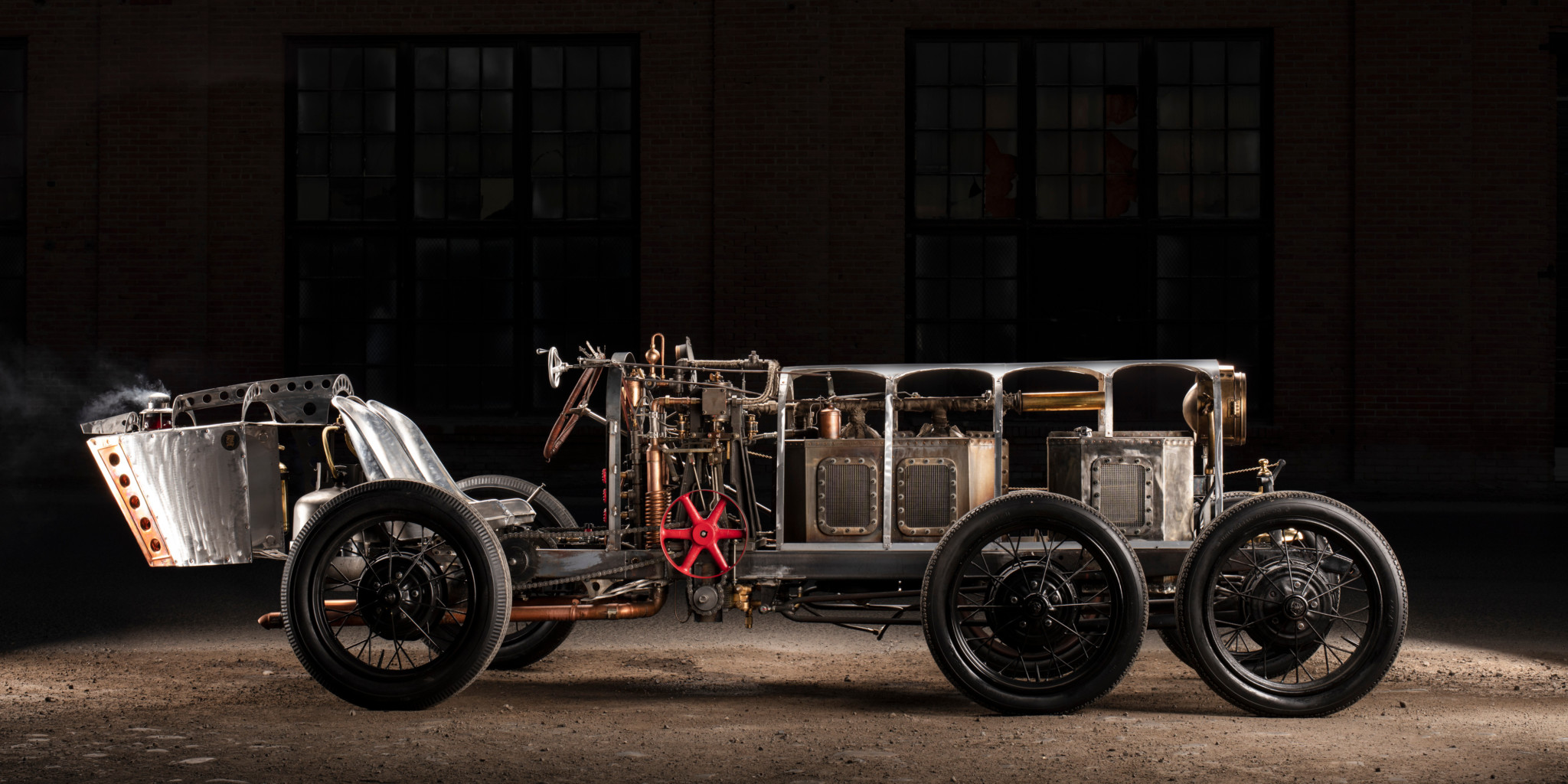 A unique custom steam-powered roadster featuring a modified 1928 Ford Model A frame, this impressive vehicle combines a narrow, extended chassis with skeletal drilled-aluminum bodywork. Emphasizing vintage style, it showcases six wheels, dual 400k-btu burners, a marine-style steam engine, and aluminum bomber-style seats, creating a striking presence reminiscent of early automotive experimentation.